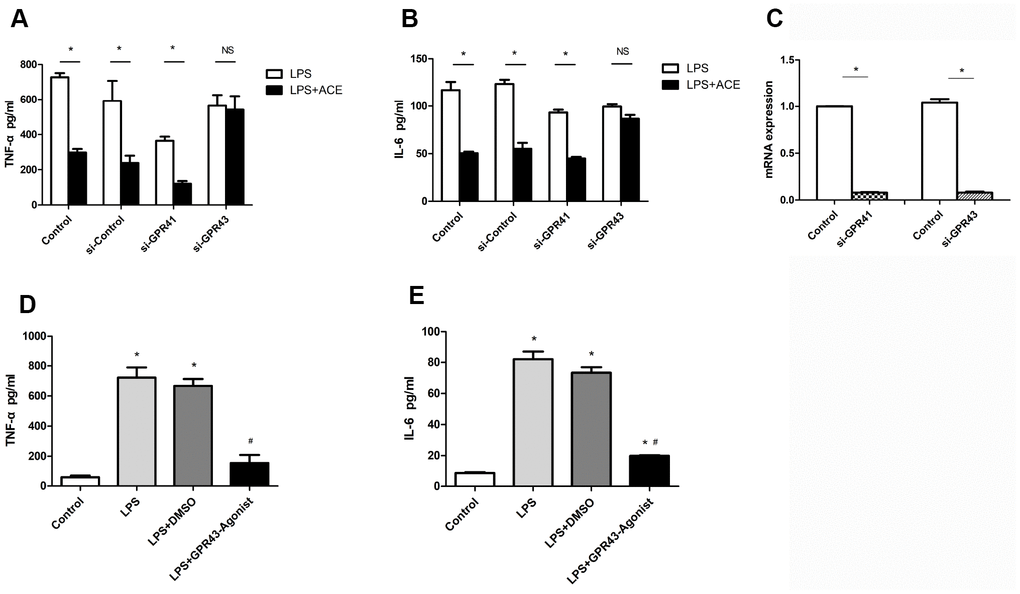 A specific GPR43 agonist was used in our study. Thirty minutes after the LPS stimulation, the GPR43 agonist (10 μM in dimethyl sulfoxide [DMSO]) and DMSO (0.2%) were added to the culture medium. After 6 h of LPS stimulation, the supernatant was collected, and TNF-α and IL-6 levels were detected via ELISA.