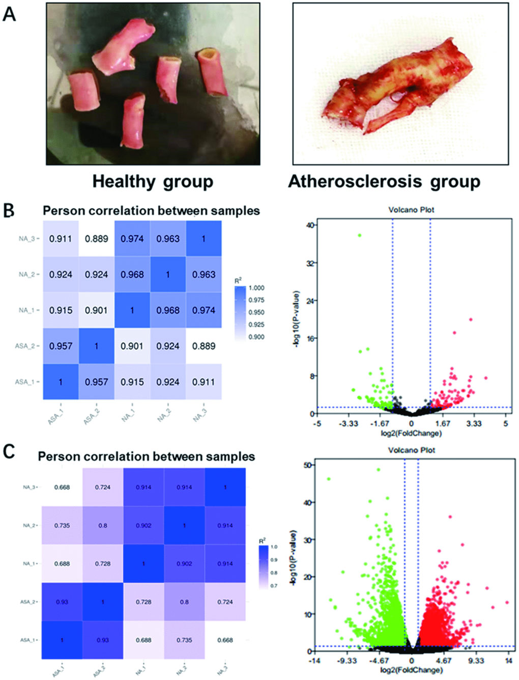 For the purpose of analyzing differentially expressed miRNAs and mRNAs, three cases of atherosclerotic plaque collected from patients with atherosclerosis and two cases of normal carotid artery from patients with accident were separately used for RNA-sequencing. These samples were photo’d in Figure 1A, which the left panel presented the normal carotid artery (namely Healthy group) while the right panel showed the atherosclerotic plaque (namely Atherosclerosis group). Commonly acknowledged, biological replicates are usually required for any biological experiment, and usually defined as measurements of biologically distinct samples with biological diversity [22]. In general, the correlation coefficient closer to 1 stands for higher similarity on expression pattern between samples. Among RNA-sequencing process, biological replicates were conducted in our collected samples. The heat maps separately for miRNAs and mRNAs, clearly showing difference of intergroup samples and repetition of intra-group samples, were visualized in Figure 1B, 1C (Left panel). In RNA-sequencing test for screening differentially expressed miRNAs, the volcano plot was obtained with the criteria of |log2FC|>1 and P < 0.05. As shown in Figure 1B (Right panel), a total of 141 miRNAs were differentially expressed in atherosclerosis samples, wherein 68 were upregulated and 73 were downregulated. Similarly, the volcano plot was generated with the abovementioned criteria for RNA-sequencing test for screening differentially expressed mRNAs. As displayed in Figure 1C (Right panel), a total of 4,848 mRNAs were differentially expressed in atherosclerosis samples. Among them, 2,350 were upregulated and 2,694 were downregulated. Conjointly, these results indicate the reliability of RNA-sequencing and reveal differentially expressed miRNAs and mRNAs in atherosclerosis.