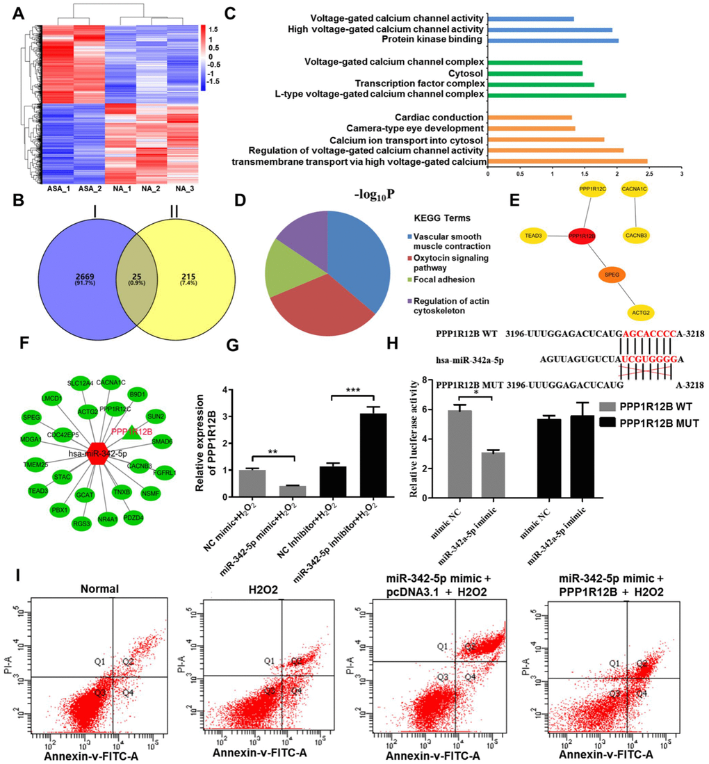 In general, genes with the similar expression pattern could be gathered together according to Cluster analysis, suggesting that they possibly have common functions or participate in common metabolic and signaling pathways. The differentially expressed mRNAs obtained from RNA-sequencing analysis were used to conduct [R] Cluster analysis. This result was displayed in Figure 4A, among which the red presented upregulated mRNAs and the blue indicated downregulated mRNAs. In order to screen a target of miR-342-5p in atherosclerosis, three databases, Miranda, PITA and RNAhybrid, were initially employed for prediction, and 240 overlapped genes were thus obtained. Subsequently, as shown in Figure 4B, 2694 downregulated mRNAs in RNA-sequencing and these 240 genes obtained from three databases were further overlapped. Twenty-five genes were thus obtained, which were not only targets of miR-342-5p, but also downregulated in atherosclerosis. Next, these twenty-five genes were used for GO and KEGG enrichment analyses. As shown in Figure 4C and Table 3, GO analysis revealed that their biological processes were essentially enriched in calcium ion transmembrane transport via high voltage-gated calcium channel, regulation of voltage-gated calcium channel activity and calcium ion transport into cytosol. When it turned to cellular component, they were predominantly concentrated in L-type voltage-gated calcium channel complex, transcription factor complex and cytosol. As for molecular function, they were generally centralized on protein kinase binding, high voltage-gated calcium channel activity and voltage-gated calcium channel activity. As for KEGG analysis, results presented in Figure 4D and Table 4 clearly conveyed the information that these overlapped genes were predominately associated with vascular smooth muscle contraction and oxytocin signaling pathway, which have reportedly been involved in occurrence and development of atherosclerosis [23–27]. Furthermore, the interaction of these twenty-five overlapped genes was first analyzed by STRING, and then imported into Cytoscape. The hub genes were thus obtained in Figure 4E and Table 5 as analyzed by Hubba plug-in according to degree score. Among these hub genes, PPP1R12B with the highest degree score was simultaneously associated with vascular smooth muscle contraction and oxytocin signaling pathway as above KEGG analysis indicated. In addition, the network interaction between these twenty-five overlapped genes and miR-342-5p was visualized by Cytoscape as displayed in Figure 4F. In no small measure was therefore PPP1R12B a target of miR-342-5p in atherosclerosis. To verify this result, the effect of miR-342-5p on PPP1R12B expression in HUVECs’ lesion model was explored. As shown in Figure 4G, PPP1R12B expression exerted a decline in miR-342-5p overexpressing group (miR-342-5p mimic+H2O2) in comparison with NC group (NC mimic+ H2O2). As for miR-342-5p knockdown group, reverse results were obtained. These results indicated that miR-342-5p could constrain PPP1R12B expression in HUVECs’ lesion model. As shown in Figure 4H, the dual luciferase reporter gene assay confirmed that PPP1R12B was a target of miR-342a-5p. The relative luciferase activity was decreased in co-transfection of pGL3- PPP1R12B -WT with miR-342a-5p mimic, compared with the control of mimic NC (P< 0.05), and there was no significant difference in luciferase activity in co-transfection of pGL3- PPP1R12B -Mut with miR-342a-5p mimic (P> 0.05), indicating that miR-342a-5p was bound to the PPP1R12B gene. Additionally, miR-342-5p mimic and PPP1R12B overexpression vector were transfected into HUVEC, and pcDNA3.1 was set as the control group, followed by H2O2 induction at 1500uM. According to Figure 4I, the apoptosis rate of HUVEC was decreased after transfection of PPP1R12B overexpression vector compared with pcDNA3.1 group, indicating that PPP1R12B could reverse the apoptosis caused by miR-342-5p to some extent. Apoptosis rate of HUVECs at 1500uM of H2O2 in each group was presented in Table 6: 7.1% (Normal), 19.0% (H2O2), 29.3% (miR-342-p mimic+pcDNA3.1+H2O2) and 21.0% (miR-342-p mimic+PPP1R12B+H2O2), respectively. The evidence upon above sides unearth that PPP1R12B is a target of miR-342-5p in HUVECs impaired by H2O2.