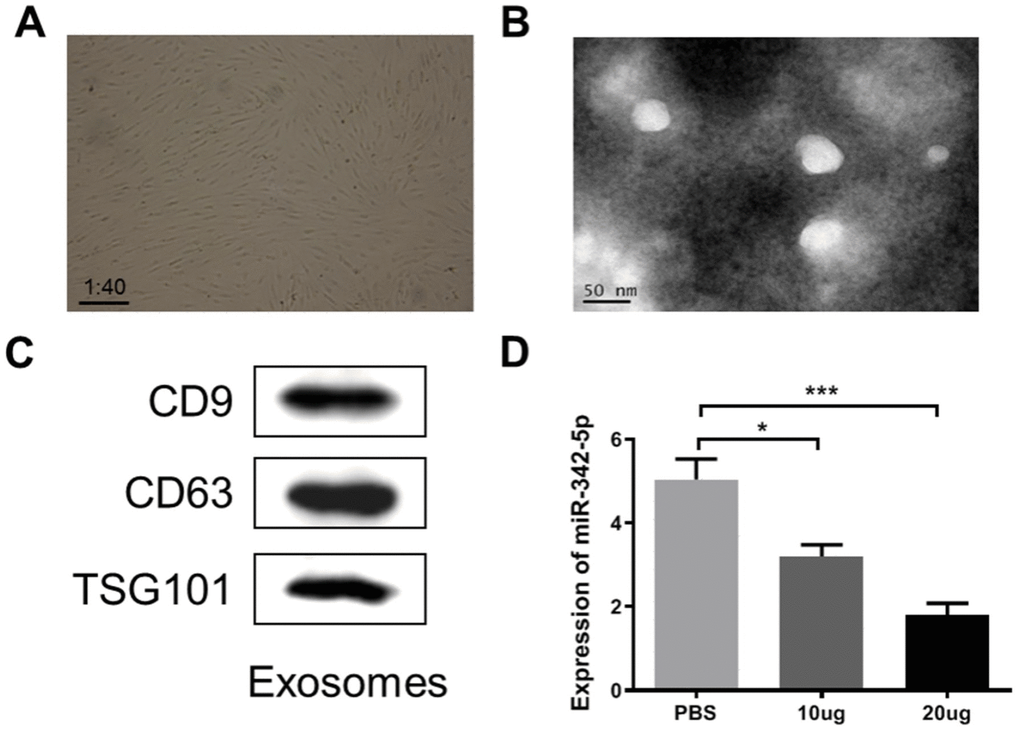Commonly accepted, ADSCs can differentiate into cardiomyocytes or endothelial cells [28], and are extensively applied in clinical trials involved in regeneration of cardiac tissue, angiogenesis, and prevention of ischemia [29, 30]. Exosomes from ADSCs have been reported to be associated with angiogenesis, cardiac function and infarct size after ischemia [31]. It was therefore tempting to speculate that ADSCs-derived exosomes, to some extent, was participated in the development of atherosclerosis. With an aim to initially reveal the potential of ADSCs-derived exosomes involved in atherosclerosis, their effect on miR-324-5p was analyzed. At first, ADSCs were observed via a microscope at a magnification of ×40 after isolated and cultured for 24 h. As clearly shown in Figure 5A, a large proportion of the adherent cells were in spindle-like shape at the stage of cell culture. Next, exosomes purified from the culture supernatants of ADSCs were characterized by TEM. Results in Figure 5B displayed that exosomes were round membrane-bound vesicles with 30 to 150 nm diameter. As the common marker proteins for exosomes, expression levels of CD9, CD63 and TSG101 were determined by western blot assay. As expected, CD9, CD63 and TSG101 were detectable and presented in extracted exosomes (Figure 5C). Finally, the obtained exosomes at a mass of 10 ug or 20 ug was respectively added into HUVECs impaired by H2O2 at a concentration of 1500 uM. The expression level of miR-342-5p was subsequently detected by qRT-PCR assay. As shown in Figure 5D, miR-342-5p presented an evidently decreased expression level in exosomes group (both 10 ug and 20 ug) when compared to PBS normal group (P<0.05, P<0.001). Taken together, these findings suggest that ADSCs-derived exosomes inhibit the expression of miR-342-5p in HUVECs impaired by H2O2.