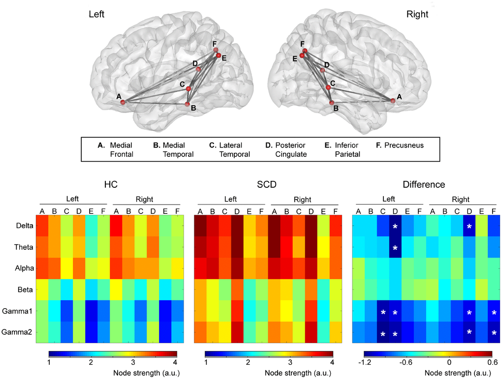 In conclusion, our MEG data demonstrated an increased DMN functional connectivity in individuals with SCD versus HC, suggesting that the self-reported subjective cognitive complaint is a reflection of objective alterations in brain function. Furthermore, the node strength of the delta and gamma frequencies in the PCC may be a good imaging indicator in the discrimination of SCD from HC.