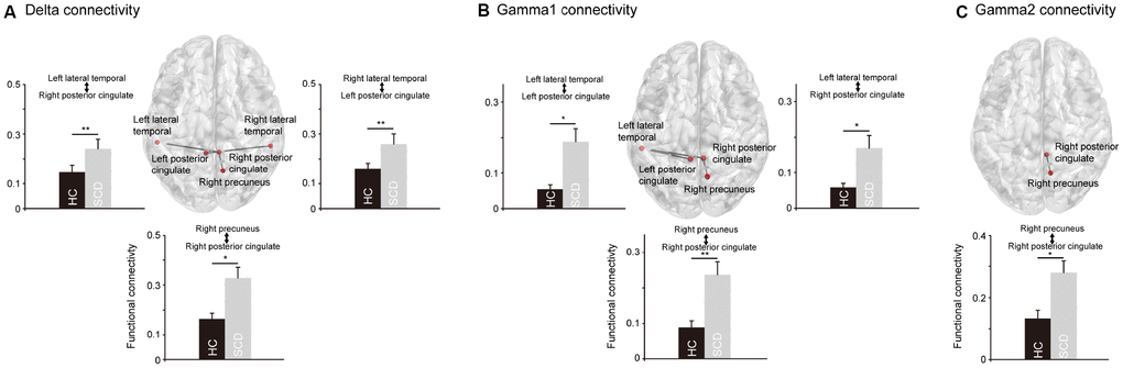 One may argue that the gamma oscillations pertain to a relatively local, rather than long-range, synchronization. Compared with the HC group, we found that the SCD group demonstrated stronger gamma oscillations over short-distance (e.g., right PCC to right PCu) and long-distance (e.g., right PCC to left LTC) connectivity. Over the past decade, there has been increasing evidence suggesting that gamma-band oscillations are involved in both local and long-range connectivity [47]. For example, Rodriguez-Rojo et al., recruiting 36 cognitively intact older females, found that compared to BDNF Val/Val individuals, those with Val/Met showed diminished antero-posterior gamma connectivity (e.g., left gyrus rectus-right lateral superior occipital lobe) [48]. Although the mechanisms behind the increased gamma-band connectivity in SCD versus HC remain elusive, our present results suggest that the altered synchronization of this frequency band in both short- and long-distance connectivity may represent one of the underlying neural signatures of SCD.