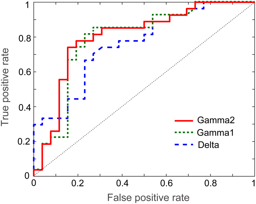 Receiver operating characteristic (ROC) curve analysis was used to evaluate whether network measurement could serve as a good neurophysiological marker for the discrimination of SCD from HC. In this study, the node strength and AEC values with significant group differences were used in the ROC curve analysis; moreover, the summation of node strength from bilateral ROIs was also explored. Notably, node strength in the PCC exhibited a good discrimination ability at the delta (area under curve [AUC] = 0.759, sensitivity = 0.704, specificity = 0.731, p = 0.001), gamma1 (AUC = 0.789, sensitivity = 0.851, specificity = 0.769, p < 0.001) and gamma2 (AUC = 0.803, sensitivity = 0.778, specificity = 0.808, p < 0.001) bands (Figure 3). In contrast, when using node strength or AEC values in other DMN areas, all the AUC values were < 0.7 at the corresponding bands.