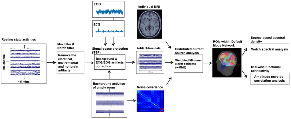 MEG, as it possesses a better spatial resolution than EEG, is suitable for elucidating the local cortical activities and functional connectivity in different oscillatory bands at the source level. Moreover, the minimum norm estimate (MNE) is a distributed source imaging method that can reconstruct a number of distributed neural generators overlapping in time [31]. Hence, MNE is considered as a preferred method when investigating multiple sources compared with other reconstruction solutions [32, 33].