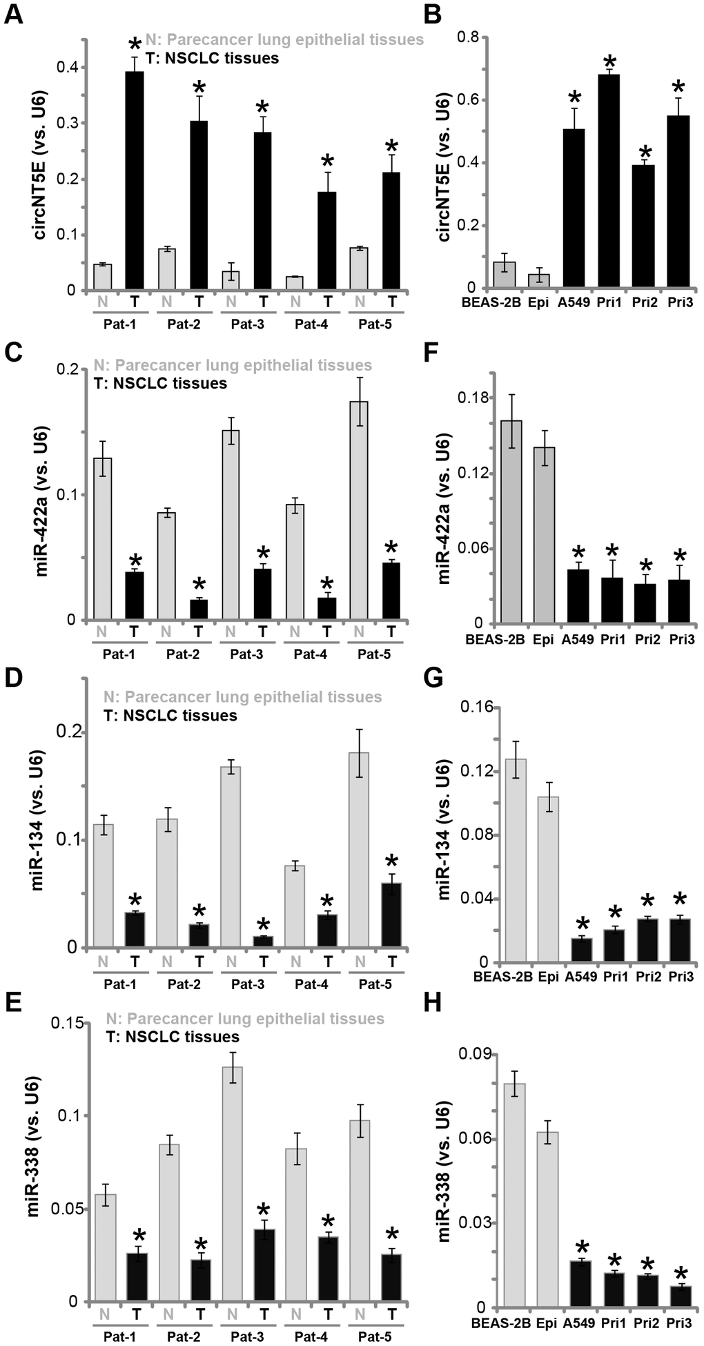 It has been previously shown that circNT5E functions as the sponges of multiple tumor-suppressive miRNAs, including miR-422a, miR-134 and miR-338 [24, 28–31]. We therefore tested the expression of these miRNAs in NSCLC tissues and cells. As demonstrated, levels of miR-422a, miR-134 and miR-338 are all decreased in the NSCLC tissues (Figure 1C–1E), as well as in the established and primary NSCLC cells (Figure 1F–1H). In contrary, miR-422a, miR-134 and miR-338 expression is relatively high in lung epithelial tissues (Figure 1C–1E) and epithelial cells (Figure 1F–1H). These results show that circNT5E is upregulated in NSCLC tissues and cells, correlating with downregulation of its targets, miR-422a, miR-134 and miR-338.