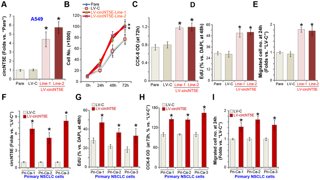 Next we tested whether ectopic overexpression of circNT5E could further promote NSCLC cell progression. A lentiviral circNT5E expression construct, LV-circNT5E, was transduced to A549 cells. Following selection two stable cell lines, LV-circNT5E-Line-1/2, were established, with mature circNT5E levels significantly increased (4-7 folds of control cells, Figure 4A). NT5E protein expression was unchanged with circNT5E overexpression in A549 cells (Supplementary Figure 1C). As shown, LV-circNT5E A549 cells grew significantly faster than the control cells with empty vector (LV-C) (Figure 4B). Additional experiments showed that overexpression of circNT5E promoted A549 cell growth, increasing the CCK-8 OD (Figure 4C) and BrdU incorporation (Figure 4D). Furthermore, “Transwell” assay results, Figure 4E, demonstrated that circNT5E overexpression significantly promoted A549 cell migration in vitro. In the primary human NSCLC cells, Pri-Ca-1/-2/-3, LV-circNT5E similarly increased circNT5E expression (Figure 4F), resulting in increases in BrdU incorporation (Figure 4G), CCK-8 OD (Figure 4H), and cell migration (Figure 4I). Collectively, these results show that ectopic overexpression of circNT5E promoted NSCLC cell growth, proliferation and migration.