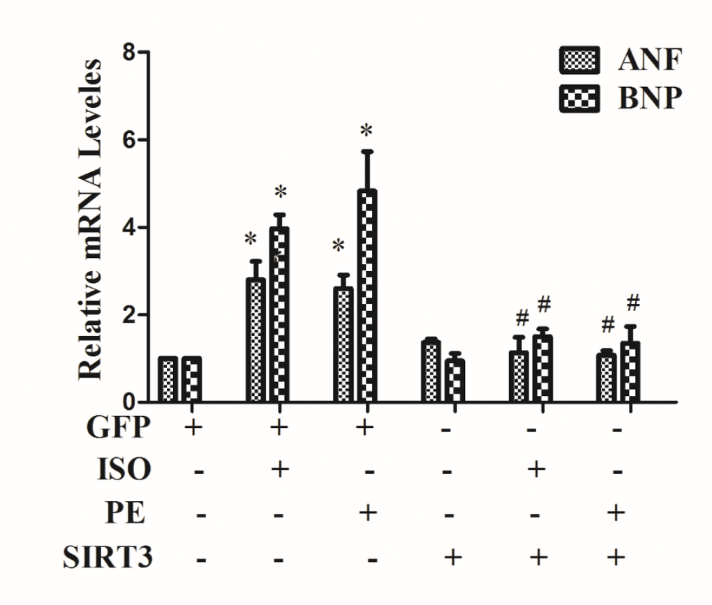 In addition, in cardiomyocytes, SIRT3 was overexpressed by Ad-SIRT3, and the inhibitory effect of Ad-SIRT3 on ISO or PE-induced cardiomyocyte hypertrophy was confirmed by detecting hypertrophic genes. The results showed that overexpression of SIRT3 reversed the upregulation of hypertrophic genes by ISO or PE (Figure 1).