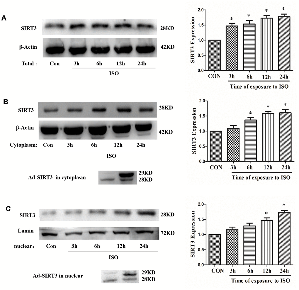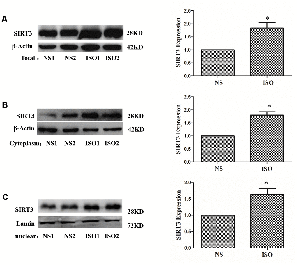 In H9c2 cells, after treatment with 10 μM ISO for 3-24 h, total protein, cytoplasmic protein and nuclear protein were extracted, and the total protein expression and distribution in cytoplasm of SIRT3 were detected by western blot. The results showed that 10 μM ISO up-regulated the total protein expression of SIRT3 and also increased the distribution of SIRT3 in the cytoplasm and nuclear (Figure 2).