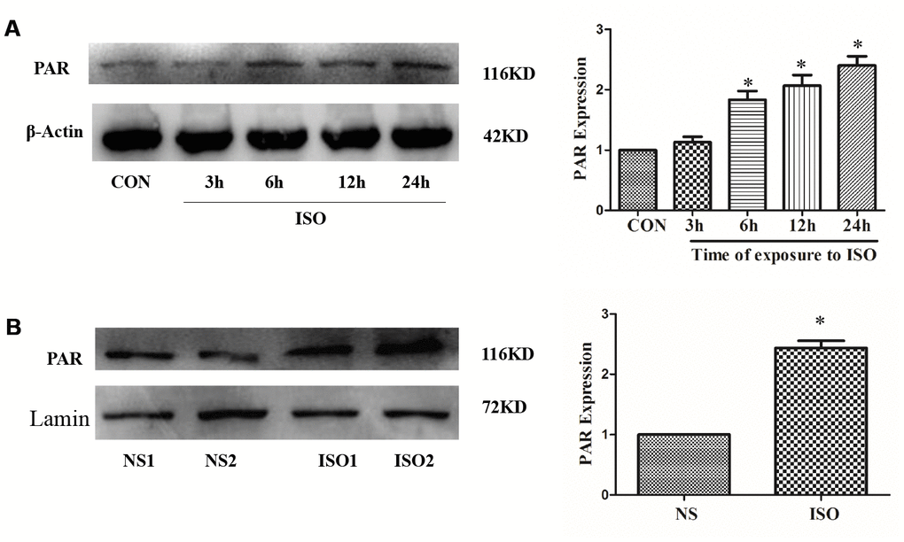 Our previous studies have shown that PARP-1 activity was significantly up-regulated in cardiac hypertrophy, while inhibition of PARP-1 activity can significantly inhibit cardiac hypertrophy [19, 35]. In H9c2 cardiomyocytes, PARP-1 activity was detected by anti-PAR antibody after 3-24 h stimulation with 10 μM ISO. The result showed that 10 μM ISO significantly up-regulated PAPR-1 activity and was most evident at 24 h (Figure 5A). In addition, in the cardiac hypertrophy model of ISO-induced SD rats, the activity of PARP-1 was also significantly up-regulated compared with the control group (Figure 5B).