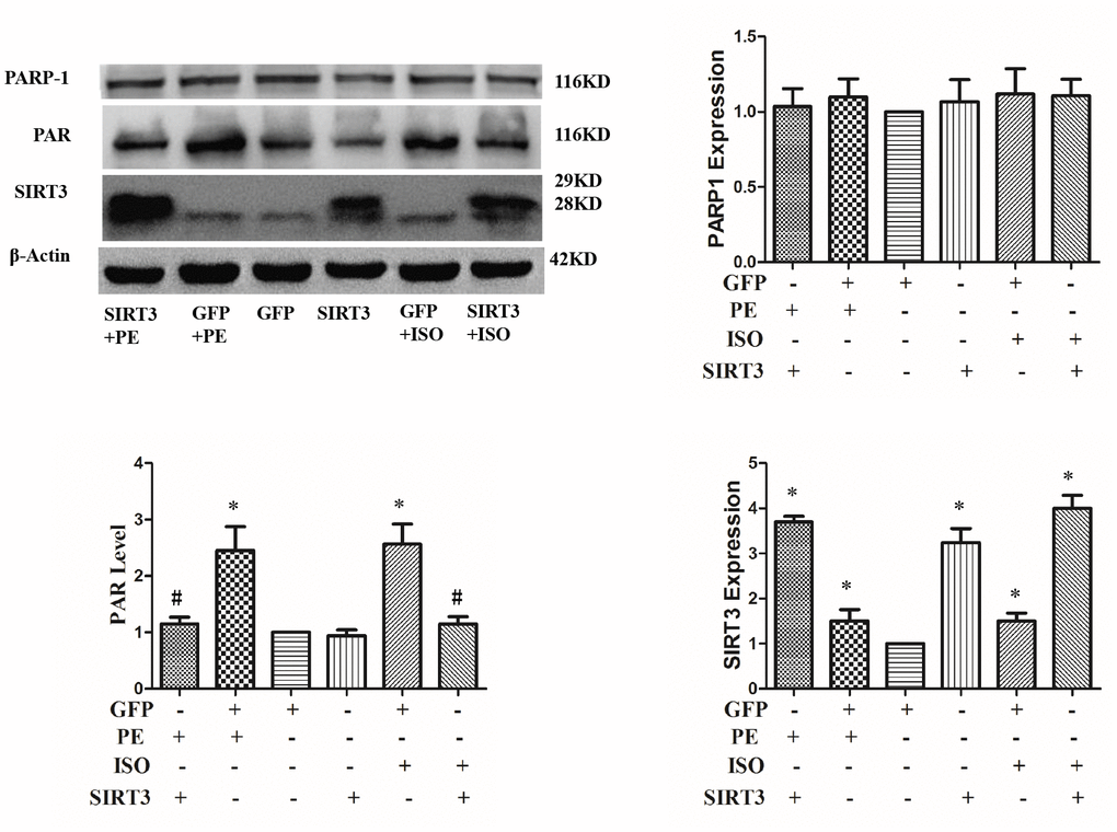 SIRT3 overexpression inhibits ISO or PE-induced upregulation of PARP-1 activity