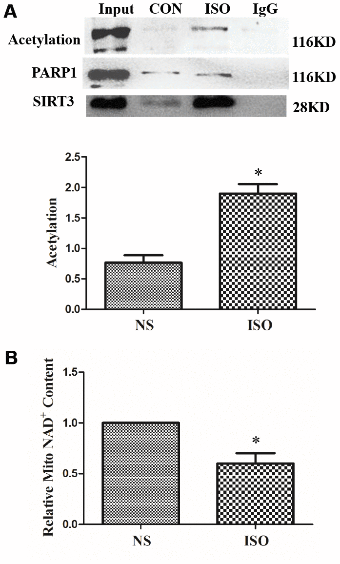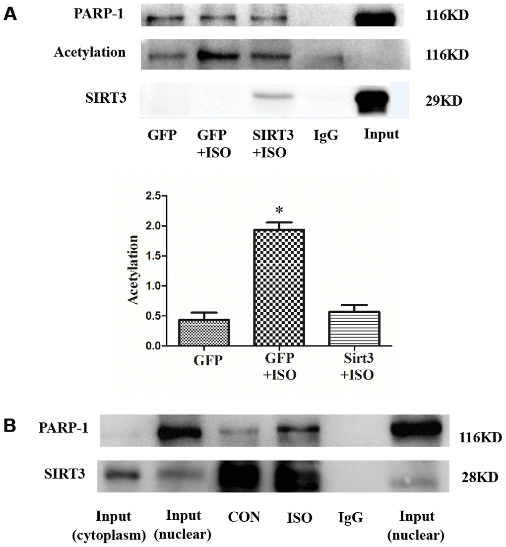 In addition, we also studied the interaction between endogenous SIRT3 and PARP-1. Since SIRT3 is mainly localized in the cytoplasm but PARP-1 is mainly localized in the nuclear, we thus extracted the nuclear protein after 24 h stimulation with 10 μM ISO and detected the interaction between SIRT3 and PARP-1 by CO-IP. The results showed that the binding of SIRT3 to PARP-1 was significantly enhanced under ISO stimulation (Figure 7B).