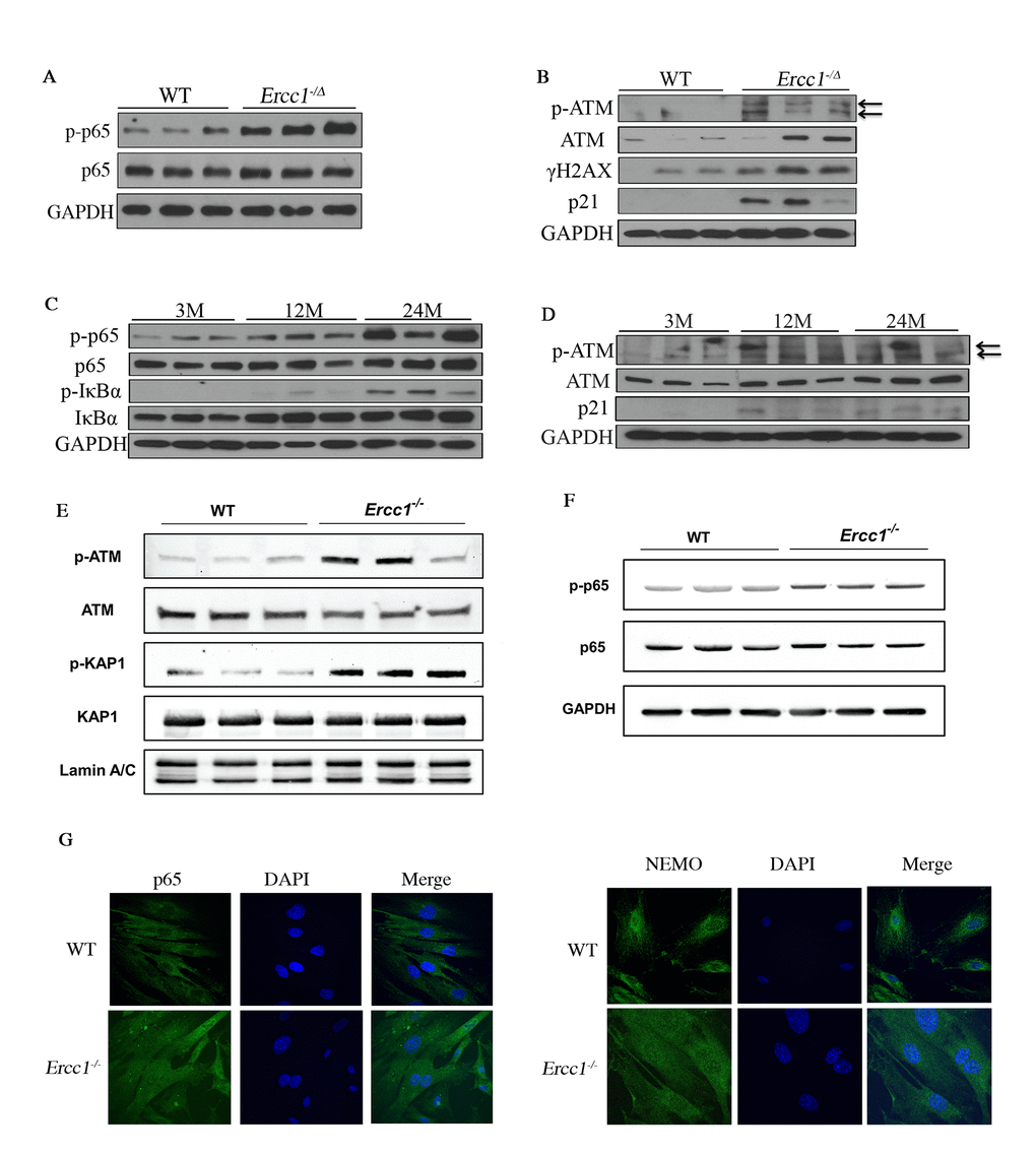 To examine ATM and NF-κΒ activation with senescence, the phosphorylation of ATM and NF-κΒ targets were measured initially in primary Ercc1-/- mouse embryonic fibroblasts (MEFs), which undergo premature senescence at 20% O2. The levels of p-ATM and p-KAP1 were increased in Ercc1-/- MEFs compared to WT MEFs (Figure 1E). Moreover, p-p65 levels were increased in passage 5 Ercc1-/- MEFs compared to WT cells (Figure 1F). There also was an increase in nuclear staining of p65 and NEMO in Ercc1-/- MEFs compared to WT cells, indicating NF-κB activation through a NEMO-dependent manner (Figure 1G). These findings suggest that NF-κB and ATM are co-activated in cells and tissues with higher levels of DNA damage-induced senescence.