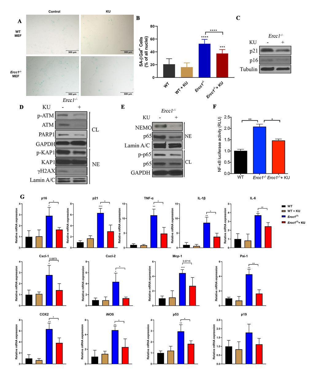 To determine if pharmacologic inhibition of ATM in Ercc1-/∆ mice confers a similar reduction in senescence and SASP markers as ATM heterozygosity, Ercc1-/∆ mice were treated three times per week i.p. for 2 weeks with 10 mg/kg of KU-55933. The mice were then analyzed for the extent of senescence and SASP in different tissues. As shown in Figure 4F, the levels of expression of senescent markers and SASP factors were measured were significantly reduced in liver tissues from Ercc1-/∆mice compared to untreated controls.