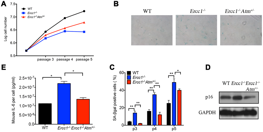 To eliminate possible off-target effects of the ATM inhibitor KU-55933, Ercc1-/- MEFs heterozygous for Atm (Ercc1-/-Atm+/-) were generated. The Ercc1-/-Atm+/- MEFs had increased proliferation compared to Ercc1-/- MEFs (Figure 3A). There also was a reduction in the percent of SA-ßgal+Ercc1-/-Atm+/- MEFs compared to Ercc1-/- MEFs (Figure 3B and 3C). Expression of p16INK4a also was reduced in the double mutant MEFs (Figure 3D). Finally, there was a reduction in the level of secreted IL-6, a SASP factor, in conditioned media from Ercc1-/-Atm+/- MEFs compared to Ercc1-/- cells (Figure 3E). Taken together, these results suggest that ATM promotes genotoxic stress-induced cellular senescence, in part, through the activation NF-κB signaling.