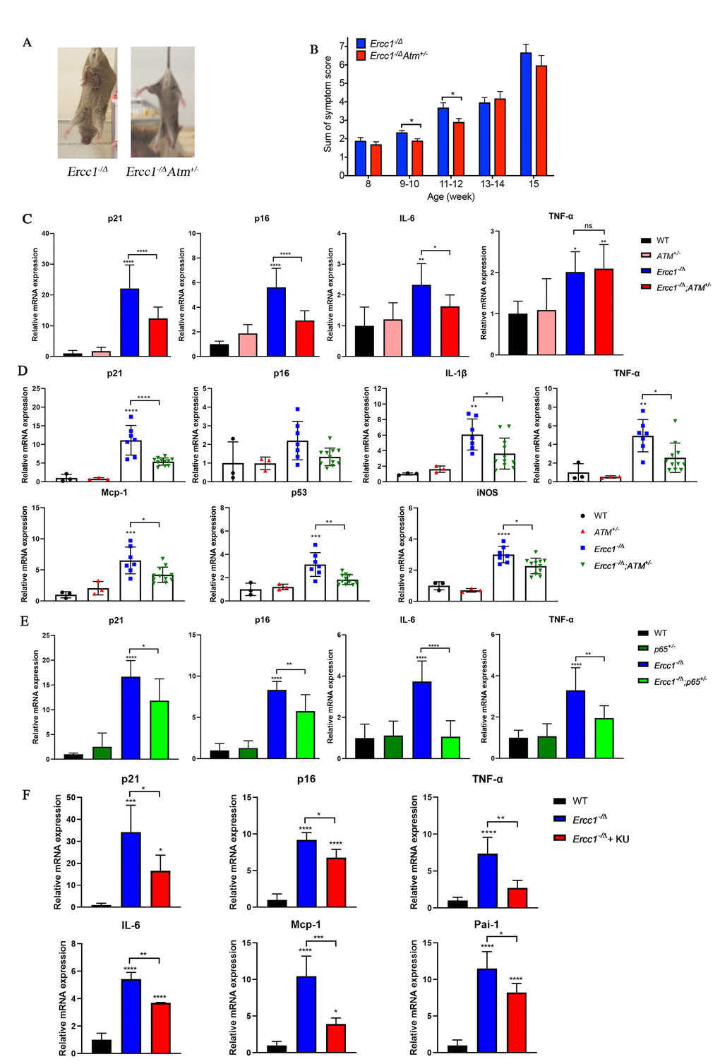 To address the role of ATM in driving NF-κB mediated senescence and aging, we used Ercc1-/Δ mice that model a human progeroid syndrome caused by impaired repair of DNA damage. The mice express only 5% of the normal level of the DNA repair endonuclease ERCC1-XPF that is required for nucleotide excision, interstrand crosslink and repair of some double-strand breaks. As a consequence, the Ercc1-/Δ mice spontaneously and rapidly develop progressive age-related diseases, including osteoporosis, sarcopenia, intervertebral disc degeneration, glomerulonephropathy, neurodegeneration, peripheral neuropathy and loss of cognition [48].