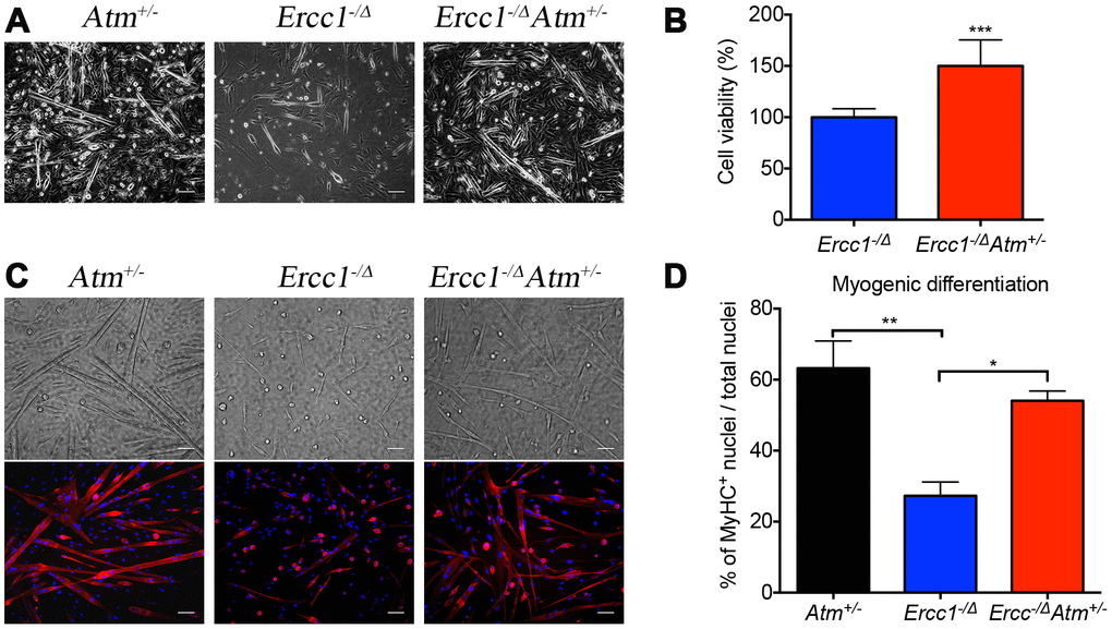 A decline in stem cell function has long been associated with aging, which in the musculoskeletal system leads to sarcopenia and muscle wasting [1, 52]. We previously reported that muscle-derived stem/progenitor cells (MDSPCs) isolated from Ercc1-/Δ mice failed to proliferate or differentiate properly, similar to MDSCPs from naturally aged mice [53]. Interestingly, the function of MDSPCs isolated from Ercc1-/∆ mice was partially restored by Atm heterozygosity (Figure 5). In fact, MDSPCs isolated from Ercc1-/∆Atm+/- mice showed similar levels of myogenic differentiation to WT mice (Figure 5A, 5C and 5D). Proliferation of MDSPCs isolated from Ercc1-/∆Atm+/- mice also increased by 50% compared to control MDSPCs (Figure 5B). This result is consistent with delayed onset and reduced severity of gait disorder observed in Ercc1-/ΔAtm+/- mice, which is partly due to severe muscle wasting (data not shown).