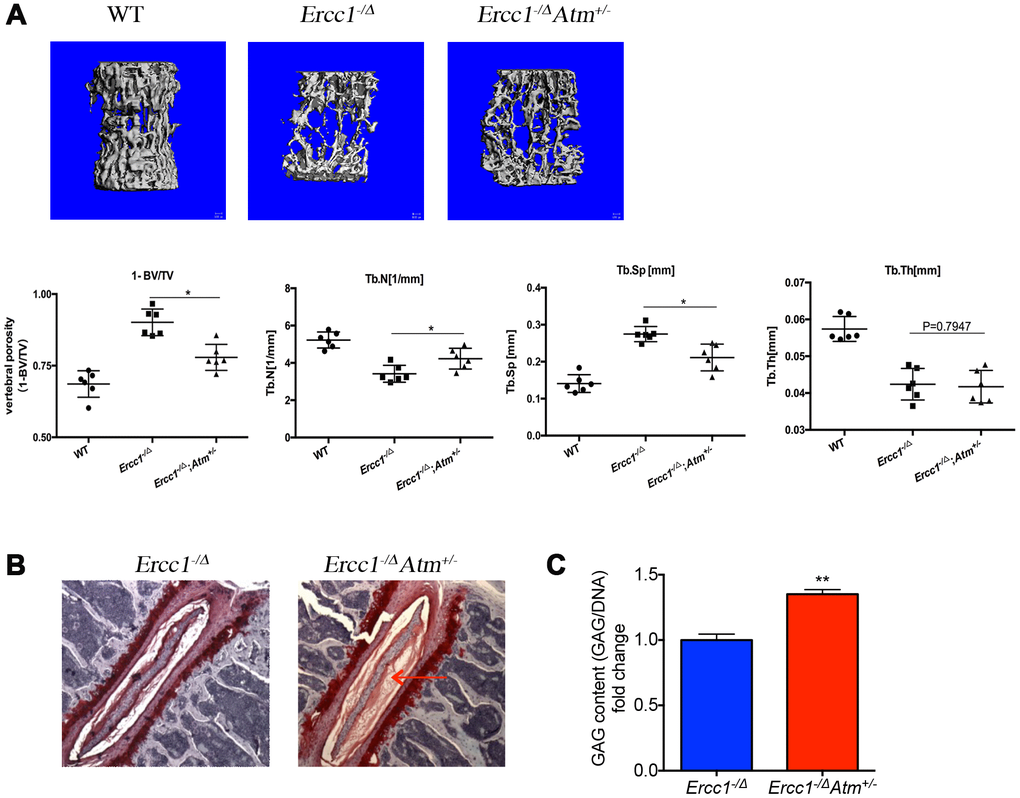 Micro-computed tomography (μCT) of spines isolated from 12-week-old wild type (WT), Ercc1–/Δ and Ercc1–/ΔAtm+/- mouse littermates were acquired using the VivaCT 40 scanner (Scanco, Switzerland) with settings: energy 55 kvP, intensity 145 μA, integration time 200ms, isotropic voxel size 15 μm, threshold 235. 3D morphometric analysis were performed on lumbar vertebrae segments (L3-S1).