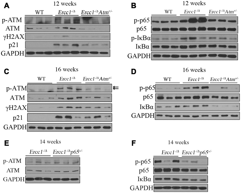 To determine if the molecular changes in Ercc1-/∆Atm+/- mice mirror that in Ercc1-/Δp65+/- mice, ATM and NF-κB activation was measured in Ercc1-/Δ and Ercc1-/Δp65+/- mice. There was no difference in the level of ATM or p-ATM between Ercc1-/Δp65+/- and Ercc1-/Δ mice (Figure 7E and Supplementary Figure 2E), suggesting that DDR/ATM signaling is the upstream regulator of NF-κB. The levels of p-p65 and total IκBα were reduced in Ercc1-/Δp65+/- mice compared to Ercc1-/Δ mice (Figure 7F and Supplementary Figure 2F), consistent with qRT-PCR results (Figure 4E) showing reduced NF-κB-mediated transcription. Taken together, these results suggest that DDR signaling plays an essential role in NF-κB activation in response to endogenous DNA damage. Moreover, the deletion of one Atm allele is sufficient to attenuate DDR signaling and dampen NF-κB activation in vivo.