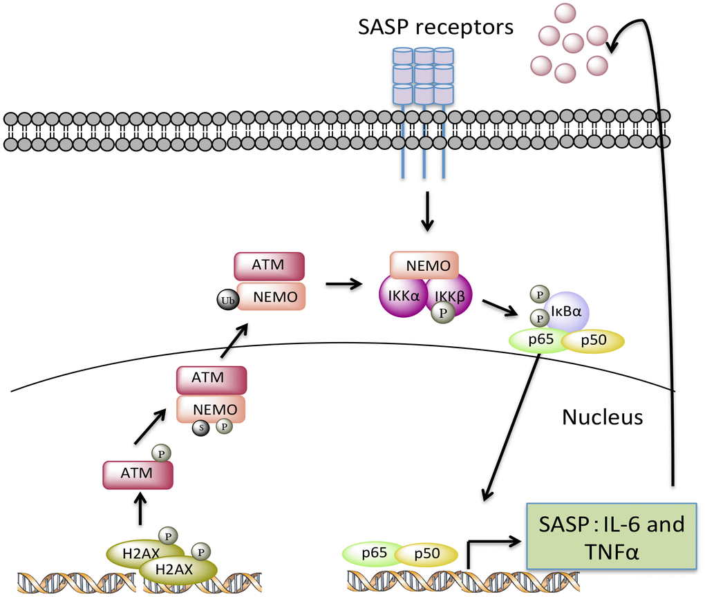 DNA damage is known to increase with aging as demonstrated by an increase in DNA damage foci (γH2AX) and oxidative DNA lesions (8,5’-cyclopurines) [44, 45]. Intriguingly, persistent DDR signaling mediated by ATM activation has been reported to contribute to cellular senescence and SASP [46]. In vitro, SASP is dependent on ATM activation, suggesting a molecular link between ATM and NF-κB [8, 46, 47]. However, it is still unclear if aberrant DNA damage-induced activation of ATM in vivo exacerbates the cellular stress response to increase NF-κB, senescence, SASP and subsequently aging.