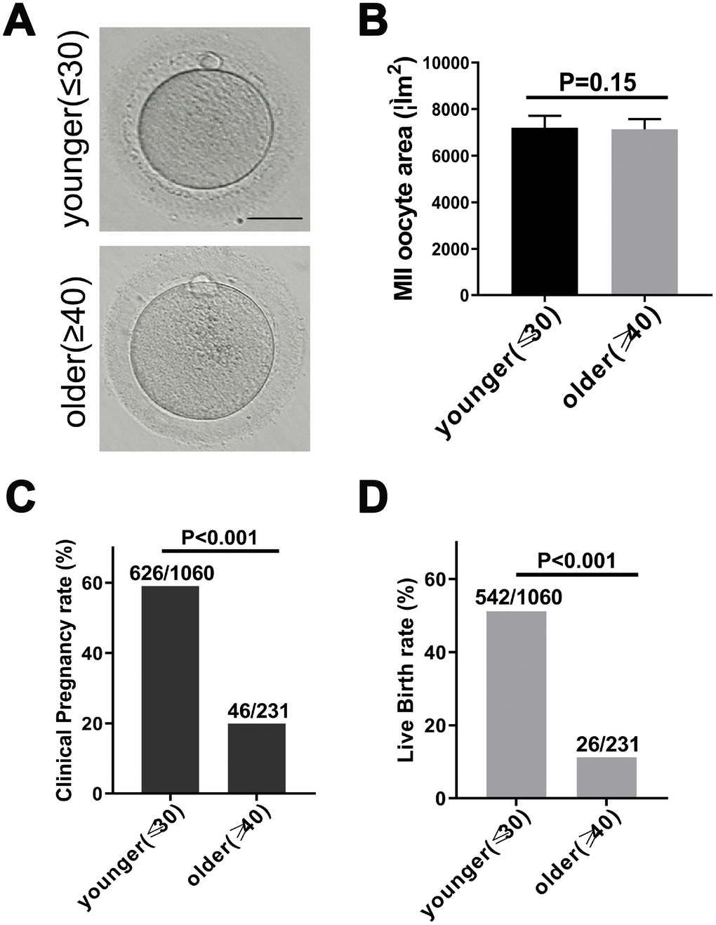 To investigate whether maternal age affected the quality of matured human oocytes, we examined the morphology of human MII oocytes from younger (≤30 years old) and older (≥40 years) patients under the microscope. The perivitelline space of the two groups of MII oocytes was same, the polar body was intact, and the oocyte morphology was the same (Figure 1A). In mice, oocyte diameters have been detected as a function of age and indicate oocyte quality [20]. Therefore, we calculated the area of younger women (27.6 ± 1.3 years, n = 170) and older women (41.6 ± 1.8 years, n = 183) MII oocytes. There was no significant difference in the area of human oocytes (Figure 1B). Next, we separately calculated the clinical pregnancy rate and live birth rate of younger and older women in the 2014-2017 fresh embryo transfer cycle. 19.91% (46/231) of female patients of advanced age had a clinical pregnancy, while 59.06% (626/1060) of female patients of younger age had a clinical pregnancy. This indicated a 83% reduction in the likelihood of clinical pregnancy in older patients (RR: 0.17 [0.12, 0.24]; p < 0.001) (Figure 1C). Similarly, 11.25% (26/231) of older patients experienced a live birth, while 51.13% (542/1060) of younger women had a live birth. This indicated an 88% reduction in the likelihood of a live birth in older patients (RR: 0.12 [0.08, 0.18]; p < 0.001) (Figure 1D). These results indicate that the clinical pregnancy and birth rates of younger and older women are significantly reduced with age.