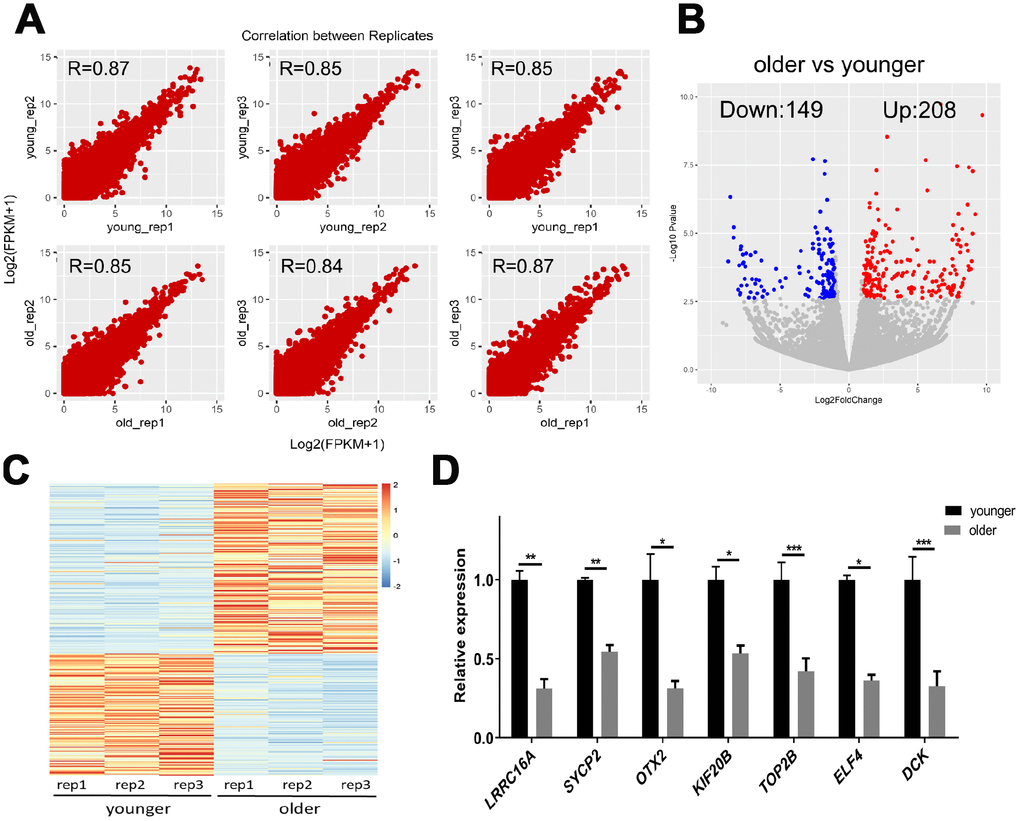 To determine differences in transcript abundance between younger and older oocytes, we performed a scRNA-seq on three younger (27.0 ± 1.0 years) and three older (43.3 ± 2.1 years) female MII oocytes using the Smart-seq2 protocol. We obtained 21–35 million monoclonal reads uniquely mapped to the genome for each sample (Supplementary Table 2). The spearman correlation coefficient between biological replicates was greater than 0.80, indicating that the biological repeat of scRNA-seq exhibited highly reproducible results (Figure 2A). Then, we identified 357 genes in younger and older patients with more reliable differential expression in oocytes (Figure 2B, 2C and Supplementary Data 1). We further selected the seven DEGs for qRT-PCR verification. SYCP2, KIF20B and LRRC16A are genes related to chromosome separation, cytokinesis and the cytoskeleton. ELF4 initiates translational switching by interaction with the RINGO binding complex. OTX2 and DCK are randomly selected DEGs. TOP2B is related to chromatin structure and gene expression regulation. The expression of selected genes in the qRT-PCR analysis was consistent with the fold change in transcriptome analysis (Figure 2D), which validated the accuracy and reliability of the sequencing data.