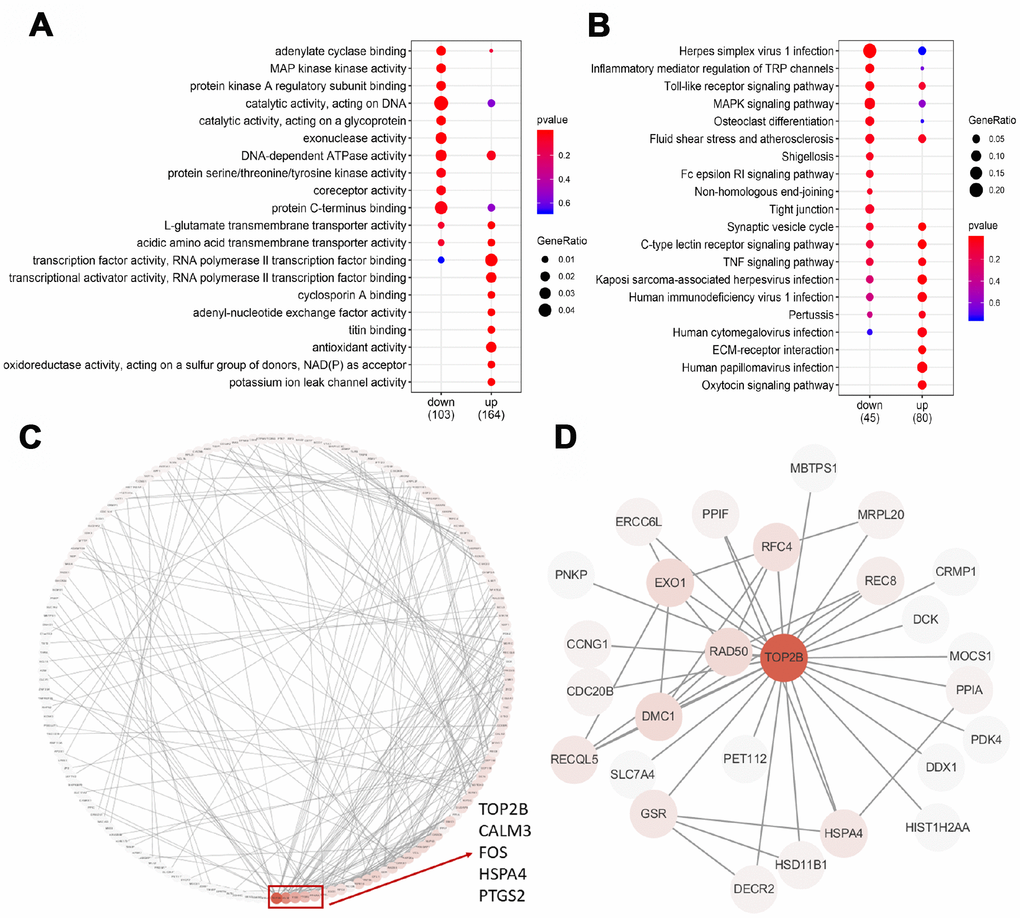 The KEGG database was used to refine the potential signaling pathways in our data. Regardless of whether the gene is up-regulated or down-regulated, the most abundant KEGG pathway is immune function (Figure 3B). The enrichment of 11 KEGG pathways of immune function is the C-type lectin receptor signaling pathway (p=0.004), Kaposi sarcoma-associated herpesvirus infection (p=0.012), human papillomavirus infection (p=0.019), human immunodeficiency virus 1 infection (p=0.020), TNF signaling pathway (p=0.026), human cytomegalovirus infection (p=0.027), Pertussis (p=0.042), Herpes simplex virus 1 infection (p=0.002), Inflammatory mediator regulation of TRP channels (p=0.020), Toll-like receptor signaling pathway (p=0.021), Fluid shear stress and atherosclerosis (p=0.045).