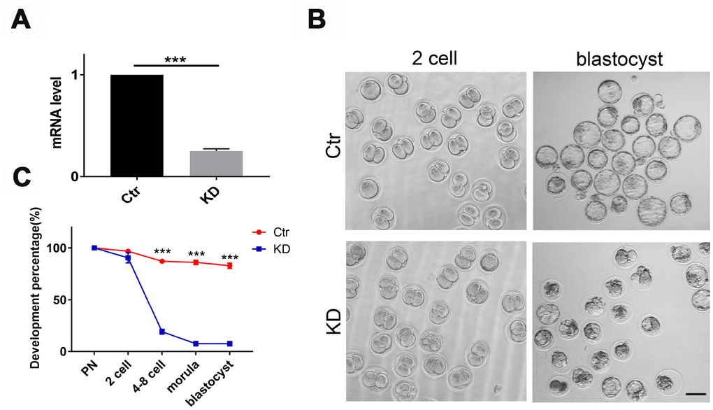 To test whether TOP2B was a key gene responsible for the quality decline in older oocytes, we knocked down TOP2B in matured oocytes of young mice to mimic the decrease in TOP2B expression in matured oocytes of older women. First, we verified knockdown efficiency by quantifying TOP2B mRNA levels, with knockdown efficiency around 70% (Figure 4A). Next, we observed early embryonic development at PN, 2-cell, 4-8 cell, morula and blastocyst stages after IVF. The embryo morphology of the knockdown group and the control group was similar at the 2-cell stages; however, most control embryos developed into blastocysts while most of the TOP2B knock-down embryos were arrested at the 2-cell stage (Figure 4B). The embryo developmental rate was counted for each time period, and the embryo developmental rate was significantly reduced in the knockdown group after the 2-cell stage (Figure 4C). In conclusion, these results indicate that mouse early embryos are arrested at the 2-cell stage if TOP2B mRNA levels were decreased in MII oocytes.