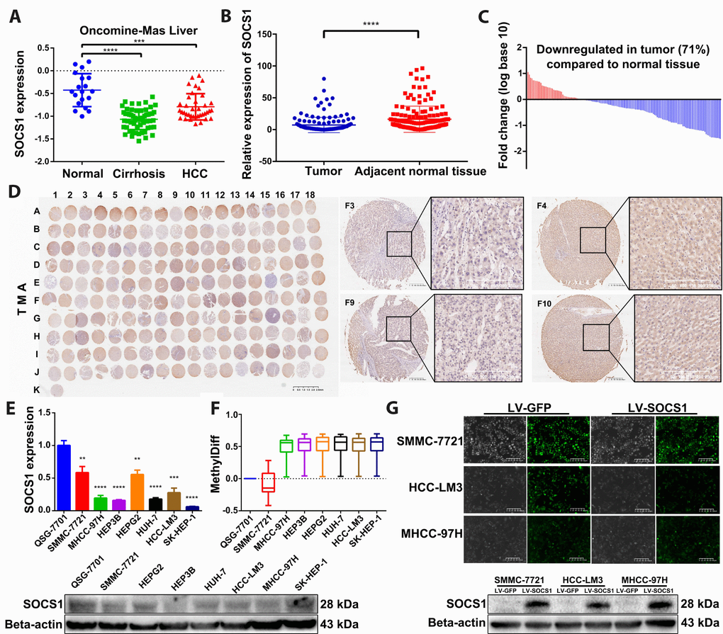 To observe the difference in SOCS1 expression between normal liver tissue and HCC, we verified SOCS1 expression in the Oncomine-Online Platform [14] and found that SOCS1 was downregulated in patients with cirrhosis and HCC and more significantly decreased in those with HCC (Figure 1A). Subsequently, we detected the mRNA expression level of SOCS1 in 159 pairs of HCC and adjacent normal tissues collected in our hospital and found that the expression pattern was consistent with that observed in tissues from the database (Figure 1B). Moreover, 71% of patients had different degrees of downregulation of SOCS1 expression in HCC (Figure 1C). In the TMA, we also observed consistent experimental results by using patient samples purchased from other research institutions (Figure 1D). Therefore, we examined the mRNA and protein expression of SOCS1 in QSG-7701 cells and 7 different HCC cell lines (SMMC-7721, MHCC-97H, Hep3B, HepG2, Huh7, HCC-LM3 and SK-Hep-1). As consistently shown by qRT-PCR and Western blot, SOCS1 was minimally expressed in most HCC cells (Figure 1E), indicating that the SOCS1 level is associated with the cancer suppressor phenotype in HCC cell lines. According to a previous study, methylation of SOCS1 is an important factor in the decrease of its expression. We examined the degree of methylation of SOCS1 in QSG-7701 cells and 7 HCC cell lines. Compared to QSG-7701 cells, all the HCC cell lines except SMMC-7721 were found to have a measurable degree of methylation (Figure 1F). After that, we selected three HCC cell lines and used lentivirus to stably overexpress SOCS1 in these lines, and the overexpression efficiency was verified prior to execution of the subsequent experiments (Figure 1G).