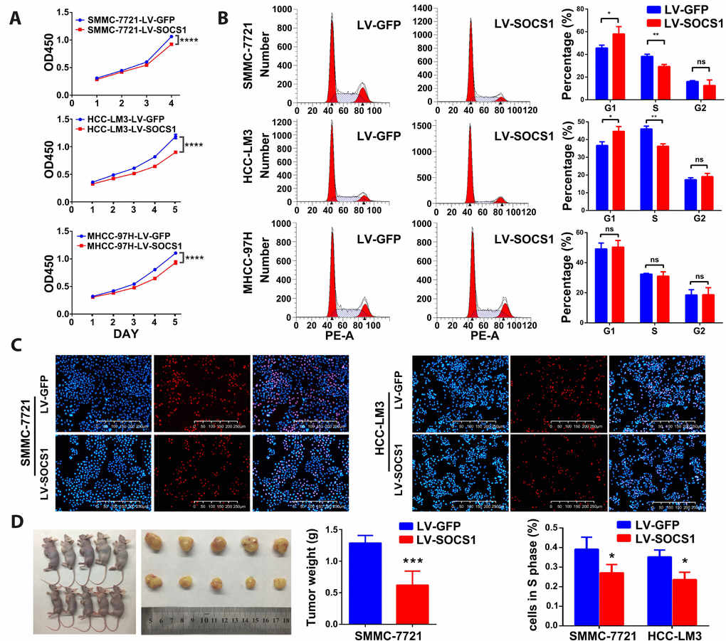 As shown in Figure 2A, the CCK-8 assays indicated that overexpression of SOCS1 markedly decreased the viability of all three HCC cell lines. To analyse the growth inhibition mechanism of SOCS1 in HCC, we used flow cytometry to detect the proportion of cells in each phase. We found that SOCS1 overexpression in SMMC-7721 and HCC-LM3 cell lines resulted in a significant increase in the proportion of cells in G1 phase and a significant decrease in the proportion of cells in S phase, indicating that there may be a block at G1-S transition. However, the MHCC-97H cell line did not exhibit G1 arrest in response to SOCS1 overexpression in our study (Figure 2B). Through the EdU experiment, we confirmed that SOCS1 was related to inhibition of the cell cycle progression of SMMC-7721 and HCC-LM3 cells (Figure 2C). To determine whether SOCS1 can also inhibit tumours in vivo, we investigated the effect of SOCS1 on tumour growth in immunodeficient nude mice. SOCS1-transfected SMMC-7721 cells or negative control cells were subcutaneously injected into mice (five animals per group). After six weeks, the mice were sacrificed, and their tumours dissected. Compared with the control tumours, tumours derived from cells with SOCS1 overexpression presented an apparent decrease in tumour size and weight (Figure 2D).