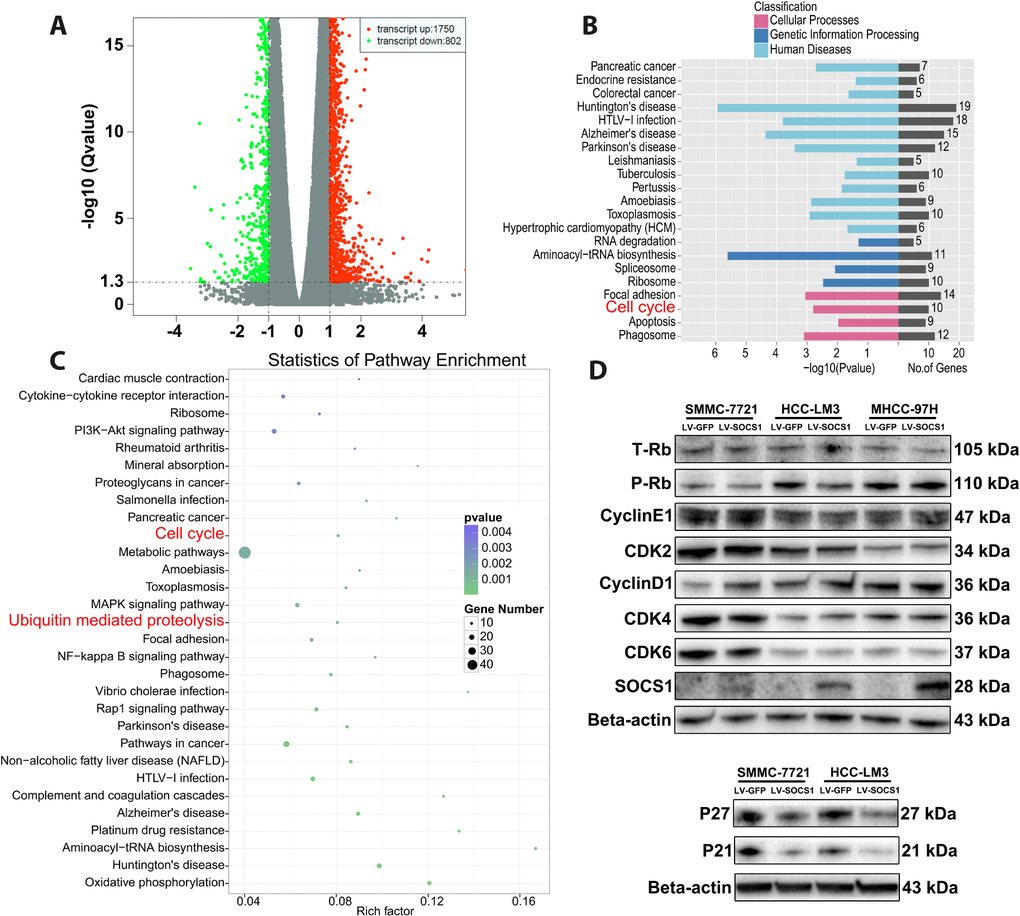 Transcriptome sequencing was used to determine the mechanism underlying SOCS1-medaited inhibition of HCC proliferation. Compared with control cells, HCC-LM3 cells transfected with a SOCS1 overexpression vector had a total of 2552 differentially expressed genes, including 1750 upregulated genes and 802 downregulated genes (Figure 3A). Furthermore, GO ontology analysis indicated that differential SOCS1 expression was associated with pancreatic cancer and colorectal cancer and affected cellular processes related to the cell cycle, apoptosis and phagosomes (Figure 3B). Pathway enrichment analysis not only suggested that SOCS1 was closely related to cancer but also showed that SOCS1 had a regulatory effect on the cell cycle. At the same time, ubiquitin, a key factor affecting the expression of cyclins, came into our view (Figure 3C). We verified by Western blot that SOCS1 overexpression reduced the levels of phosphorylated Rb in SMMC-7721 and HCC-LM3 cells. However, there was no significant change in the levels of CyclinE1, CDK2, CDK4 or CDK6. Consistent with the previous flow cytometry results, there was no significant change in the cell cycle-related proteins in MHCC-97H cells. To our surprise, CyclinD1 expression was upregulated after overexpression of SOCS1. Therefore, we measured the expression of the genes P21 and P27, which regulate the of CyclinD1 expression. It was surprising that downregulation of P21 and P27 expression was observed (Figure 3D), which was inconsistent with our original assumption.