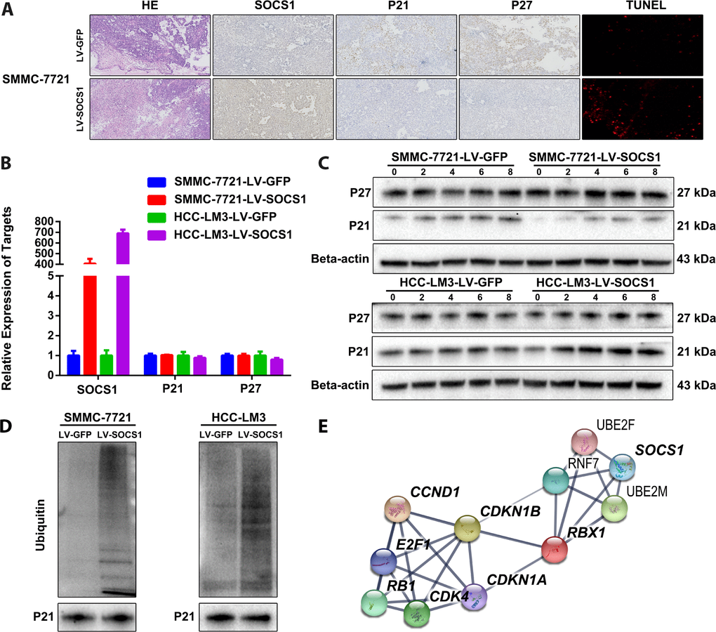 We confirmed the changes in P21 and P27 expression in tumour sections collected from nude mice. As expected, tumours derived from SOCS1-transfected SMMC-7721 cells presented decreased p21 and p27 expression compared tumours derived from control cells (Figure 4A). However, we did not observe changes in P21 and P27 in the transcriptome sequencing results, which was confirmed by qRT-PCR (Figure 4B). When combining these results with those of the pathway enrichment analysis and the structural particularity of SOCS1, we speculated that P21 and P27 may be degraded by ubiquitin. We used 20 μM MG-132 (a proteasome inhibitor) in a time course and found that MG-132 reduced the protein degradation of P21 (there is no significant difference in P27), and the effect was most pronounced at 6 hours (Figure 4C). Therefore, we collected protein from SMMC-7721 and HCC-LM3 cells 6 hours after MG-132 treatment for Co-IP detection of ubiquitin and confirmed that the ubiquitination of P21 increased in cells with SOCS1 overexpression (Figure 4D). We input the ubiquitin proteins that were indicated by transcriptome sequencing and the proteins with differential expression into the STRING analysis tool [15] and obtained a protein-protein interaction network (Figure 4E). This assessment further confirmed that SOCS1 regulates the cell cycle by recruiting ubiquitin to degrade P21.