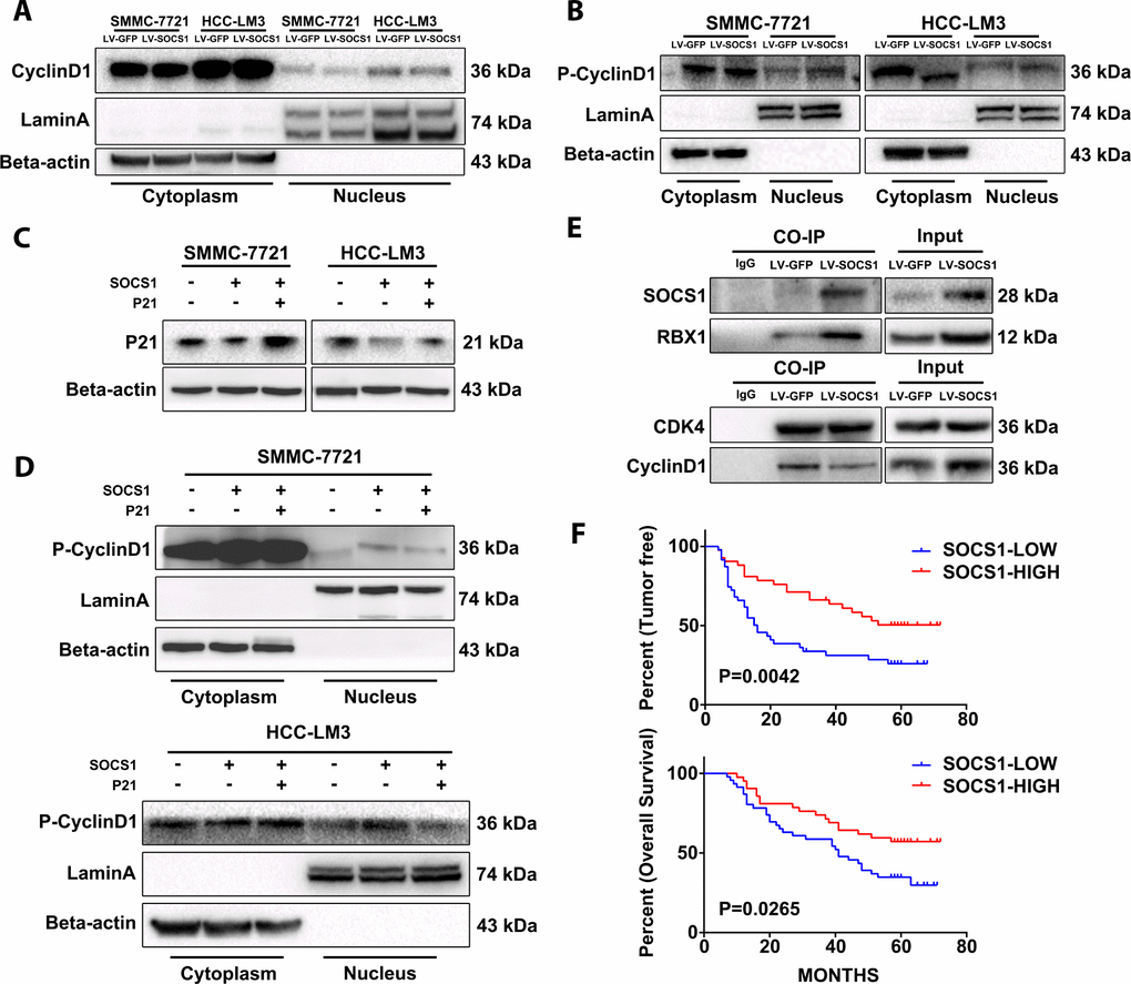 Co-IP assays were performed as previously reported [36]. Lysates from transfected HCC-LM3 were used for immunoprecipitation with SOCS1, CDK4 and IgG primary antibodies on protein A/G mix beads (Thermo Scientific, USA) overnight. Next, 20 μΜ protease inhibitor (MG-132, Sigma-Aldrich, USA) was added to the medium of transfected SMMC-7721 and HCC-LM3 cells 6 hours before lysis. Cell lysates were used for immunoprecipitation with p21 primary antibody on protein A/G mix beads overnight to detect p21 ubiquitination.