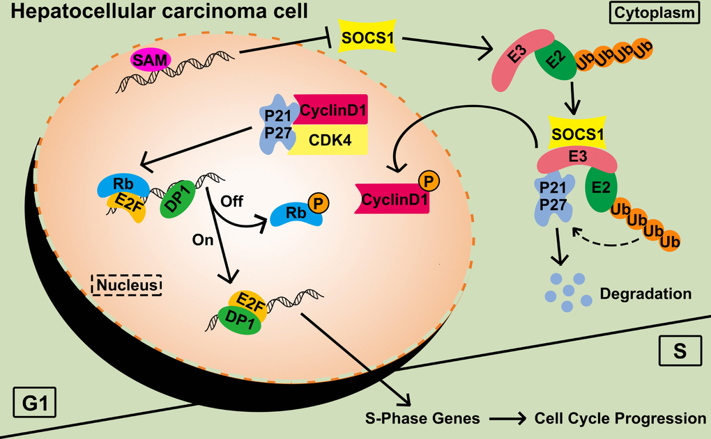 We focused on the inhibition of proliferation of HCC and found that high levels of SOCS1 expression are related to a good prognosis of HCC patients and inhibit G1-S transition of HCC cells through the P21 -CyclinD1/CDK4-Rb pathway. It has been confirmed that P21 does not always function as tumour suppressor molecule in cancer. The study highlights the mechanism by which SOCS1 suppresses the growth of HCC, which is expected to be targeted and implemented as an anticancer drug in combination with other treatments.