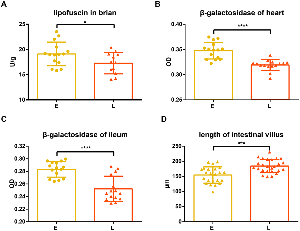 At S12, all mice were anesthetized and killed by cervical dislocation. Heart and ileum tissues were collected for histology by fixing in 4% paraformaldehyde solution overnight. Five-micrometer paraffin sections were processed for immunohistochemistry (IHC) staining and periodic acid Schiff reaction (PAS) staining. For IHC, a primary antibody against beta-galactosidase (Bioss, Beijing, China) was used. The expression level of beta-galactosidase in each tissue was determined by integrated optical density (IOD) and area. The average density (MD) of each microscopic field (objective 400×) was calculated. Five fields PAS stained paraffin sections of ileum tissue were randomly selected and the length of intestinal villi and crypt depths were measured.