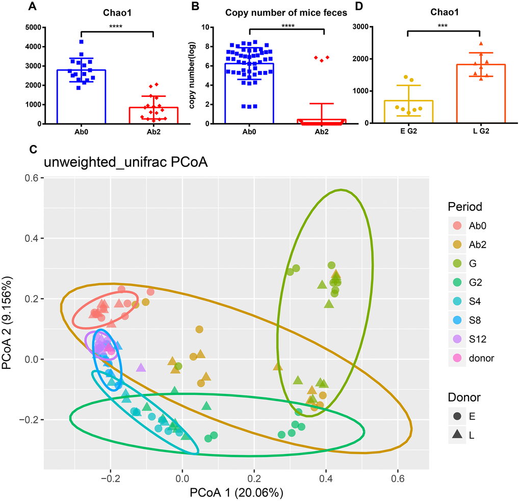 The change in gut microbiota was analyzed after the transplantation process. Ninety-nine mice fecal samples and two fecal suspensions from long-living and elder donors were collected for 16S rRNA sequencing and analysis. In total, 6,118,012 high-quality reads corresponding to 22,745 OTUs after filtering for chimeras and low-quality OTUs were identified, which were annotated to 753 genera. Three alpha diversity metrics were calculated to assess the diversity of donors and mice during the whole experiment (Supplementary Figure 2), including Shannon index, Chao1 index, and observed species. As expected, antibiotic treatment significantly decreased the diversity and total bacterial copy number in the mice (Figure 3A, 3B, and Supplementary Figure 3A, 3B, p <0.0001). Unweighted UniFrac distances were used to assess the relationship between the community structure of donors and mice, which was visualized using Principal Coordinates Analysis (PCoA) (Figure 3C). As the number of days increased, donors and recipients clustered together at S12. Alpha diversity increased slightly after the FT (fecal transplantation) phase (G2) and the increasing trend was gradual during the stationary phase (from S4 to S8). Interestingly, the rate of increase in Chao1 diversity was different between the two groups during the FT phase (from G to G2) (Supplementary Figure 2A and 2B). The Chao1 diversity of the L group at G2 was significantly greater than at G (Supplementary Figure 2B, p<0.05). However, there was no significant difference in Chao1 diversity in the E group between G and G2 phase (Supplementary Figure 2A). Consistent with this result, the alpha diversity of the L group at G2 was significantly greater than that of the E group (Figure 3D and Supplementary Figure 3C, 3D, Chao 1, observed species, p<0.001; Shannon, p<0.05).