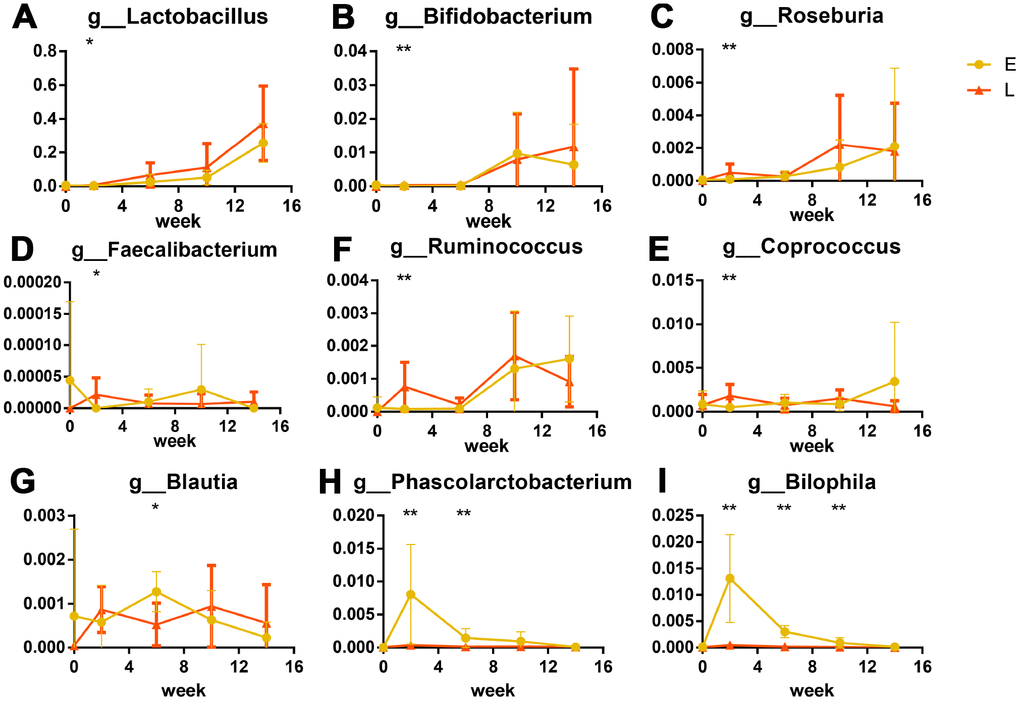 LEfSe analysis was used at the genus level to identify the differences in bacterial genera between the E and L groups. Eighty-seven genera were differential in total (Supplementary Figure 4, LDA cut-off = 2, p<0.05). A peak was observed in the number of significantly differential genera in the L group at G2. Forty-two genera were significantly more abundant in the L group than in the E group (Supplementary Figure 4). The relative abundance of Lactobacillus at G2 was significantly greater in the L group compared to the E group (Figure 4A, p<0.05); this same trend was observed throughout the entire experiment. The abundance of Bifidobacterium was significantly greater in the L group compared to the E group at G2 (Figure 4B, p<0.01).