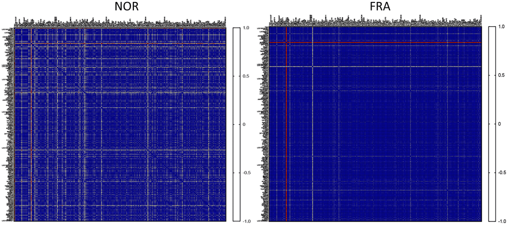 Initially, we asked how the expression among these 178 highly expressed genes is correlated between the NOR and FRA groups. To that end we calculated the correlation coefficient R (Pearson’s) for all pairwise comparisons between these 178 highly expressed genes, generating a heatmap illustrating the correlation in their expression. As shown in Figure 1, the vast majority of the genes subjected to this type of analysis was highly correlated with each other and the correlation increased in the FRA group. It is generally accepted that correlated expression or co-expression implies coregulation, by the same or similar transcription factors that define transcriptional networks [18–20]. According to the results of Figure 1, this coregulation becomes more intense during frailty. It is plausible that the lower degree of correlation in the control group (NOR) is indicative of the margins of expression at which physiological function for these genes can be attained. This flexibility is abolished in frailty because activation of signaling pathways under these conditions dictates more robust expression profiles. In line with this notion we recently reported that correlation was more intense in primary fibroblasts of outbred rodents, under endoplasmic reticulum stress as compared to unstressed cells in culture [21].
