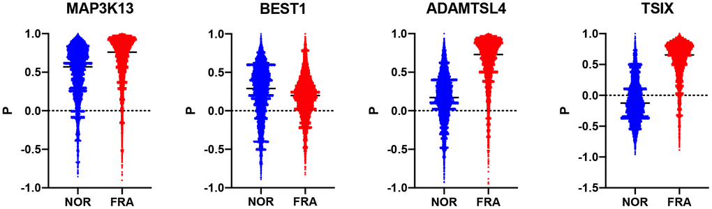 Subsequently, we estimated how the whole transcriptome is correlated with these 178 genes and compared how this correlation changes during frailty. To that end, a composite correlation (Pc) was calculated for each gene which corresponds to the correlation of the R values this gene has, with the whole transcriptome between the NOR and FRA groups. Then, we ranked these genes according to Pc (Supplementary Table 1). Therefore, high Pc indicates retention of coordination between the NOR and FRA groups while low Pc is suggestive for the loss of coordination, when the pathology emerges. The top 3 genes with lowest Pc were TSIX, BEST1 and ADAMTSL4 (-0.069, 0.074 and 0.135 respectively) while the top 3 with highest Pc were PNPT1, ORAI2 and MAP3K13 (0.462, 0.462 and 0.466 respectively) (Figure 2). These genes, such as TSIX, BEST1 and ADAMTSL4, are the ones that according to our hypotheses are being affected by (or affecting) frailty, or being affected minimally by this syndrome, such as PNPT1, ORAI2 and MAP3K13. TSIX encodes for an antisense RNA that is involved in the regulation of XIST and therefore in X chromosome inactivation [22, 23]. BEST1 encodes for a member of the bestrophin family of proteins that are calcium-activated chloride channels and have been associated with retinal disease [24, 25]. ADAMTSL4 participates in the formation of microfibrils and is associated with the development of ectopia lentis, an eye disorder [26].
