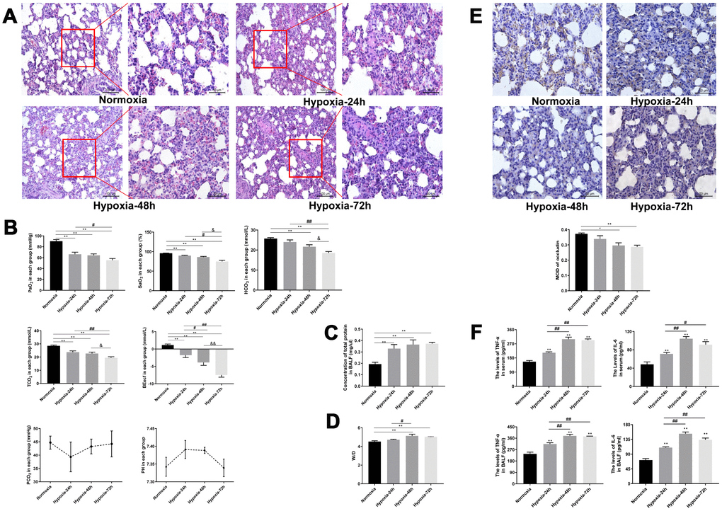 We evaluated histological, biochemical, and molecular changes in rat’s lung tissue resulting from simulated high-altitude hypoxia lasting 24, 48, or 72 h (see Materials and Methods for experiment details). All the rats showed good tolerance and survived the exposure to simulated hypoxic environment at high altitude. The normoxia group showed essentially no fluid or inflammatory cell exudate in the alveoli and well-preserved alveolar septum structure. In the hypoxia-exposed groups the intrapulmonary structure was damaged, red blood cells were visible in the alveoli and pulmonary septum, and pink fluid exudate was found in the alveoli. The pulmonary artery was congested and the pulmonary septum was significantly widened, showing also infiltrating neutrophils and macrophages (Figure 1A).