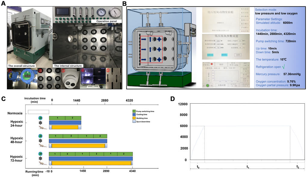 The setup of the oxygen chamber (DS850-I, Weifang Huaxin Oxygen Industry Co., Ltd.) is shown in Figure 10A. The chamber was programmed to operate on low pressure and low oxygen mode, with the cooling feature turned on. Through the operation interface, parameters such as altitude, incubation time, pump switching time, altitude rise/fall rate, and temperature were adjusted. Real-time monitoring was performed during equipment operation (Figure 10B).