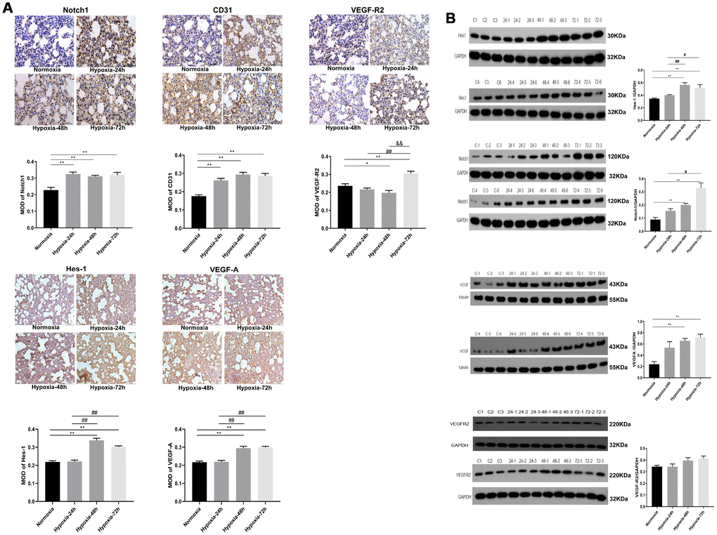 Frozen lungs’ right lower lobes were weighed, and 1 ml RIPA buffer was added to each 50-100 mg tissue fragments. Protein lysates were extracted from cells. Subsequently, magnetic beads (Thermo Fisher Scientific Inc., USA) were added, and the mix was homogenized through a high-flux tissue grinder and centrifuged at 12,000 g/min for 15-30 min to collect the supernatant. Following protein concentration determination (BCA protein concentration assay kit; Solarbio, Beijing, China), protein extracts from tissue and cell culture samples were lysed with 1x loading buffer, boiled for 5 min, and subjected to SDS-PAGE. Proteins were next transferred onto PVDF membranes (LIUYI, Beijing, China) at 4°C applying 200 mA (constant current) for 1 h. The membranes were then immersed in blocking solution for 30 min at room temperature, cut at the imprinted position of the protein, and incubated with notch1(1:1000, rabbit lgG; Proteintech Group, Inc., Chicago, IL), Hes-1(1:200, rabbit IgG; Abcam, USA), VEGF-A (1:200, mouse lgG; Abcam, USA), VEGF-R2 (1:250, rabbit lgG; Abcam, USA), GAPDH (1:5000, Proteintech Group, Inc., Chicago, IL) and Tubulin (1:1000, Abcam, USA) for 2 h at room temperature. Afterwards, the membranes were rinsed with TBST and incubated with corresponding secondary antibodies (1:3000, HRP-conjugated goat anti-rabbit/mouse IgGs; Proteintech Group, Inc., Chicago, IL) in TBST at room temperature for 1 h. After rinsing with TBST, the membranes were developed using Super ECL Plus luminescent solution for 2 min and fixed.