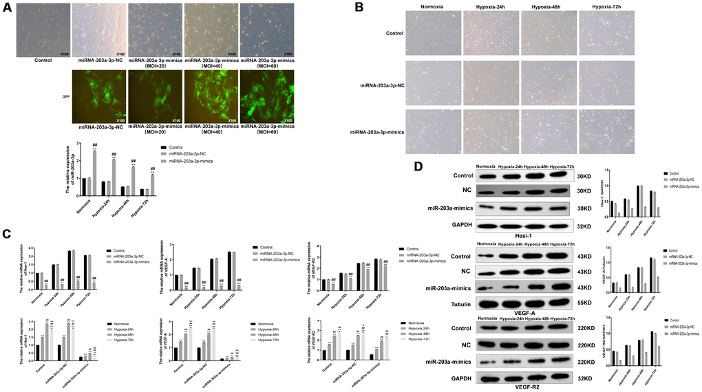 PMVECs were cultured overnight and transduced with HBLV-GFP-PURO (negative control, NC), HBLV-miR-203a-GFP-PURO (miR-203a-3p-mimics), HBLV-VEGF-shRNA-GEP-PURO (VEGF-shRNA) vectors. PMVECs that transduced with HBLV-VEGF-shRNA-GFP-PURO vectors simultaneously transfected with antisense oligonucleotides-negative control (VEGF-shRNA+ASO-NC) or antisense oligonucleotides (VEGF-shRNA+ASO). After 24 hours, fresh medium was added and the culture was continued. Infection efficiency was analyzed by assessing cell fluorescence at 72 h.