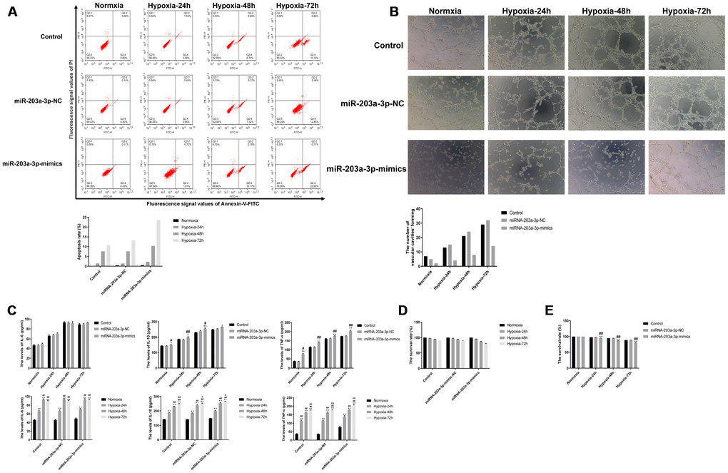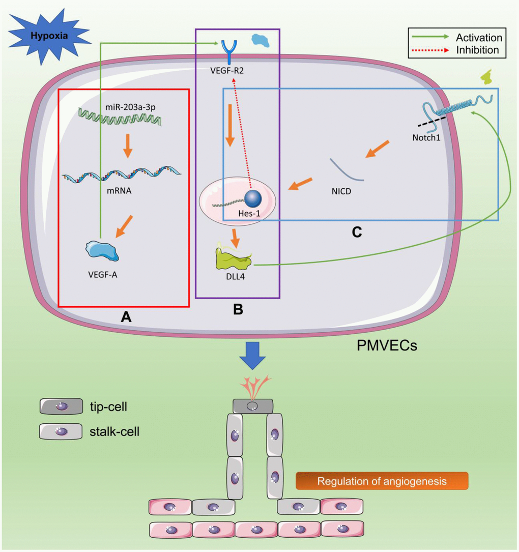 On the other hand, in vitro Matrigel angiogenesis experiments indicated a stimulatory effect of hypoxia on angiogenesis in the three PMVECs groups. However, the angiogenic ability of PMVECs was reduced after transfection with miR-203a-3p-mimics (Figure 6B).