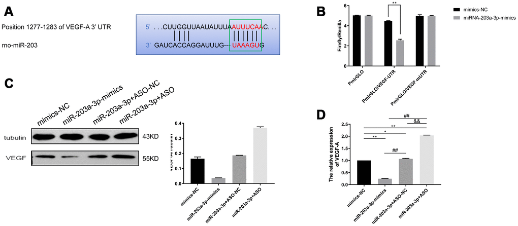 To explore whether VEGF-A is a direct target of miR-203a-3p, we constructed dual-luciferase reporter plasmids containing either the wild-type 3′-UTR sequence of the VEGF-A mRNA (pmirGLO/VEGF-UTR) or a mutant 3′-UTR variant (pmirGLO/VEGF-mUTR) (Figure 7A). These were alternatively co-transfected with vectors containing either miR-203a-3p-mimics or a non-functional miRNA sequence (negative control), and relative luciferase activity was determined for each VEGF construct. There was no change in fluorescence after transfection of pmirGLO/VEGF-mUTR in the presence or absence of miR-203a-3p-mimics, while luciferase fluorescence decreased after transfection of pmirGLO/VEGF-UTR along with the functional miR-203-3p-mimics construct (P < 0.01) (Figure 7B). These data indicated that miR-203-3p has a direct regulatory effect on target VEGF-A mRNA. Next, western blotting and qRT-PCR were used to detect VEGF-A expression in cells transfected with vectors containing either, miR-203a-3p-mimics-NC, miR-203a-3p-mimics, or antisense oligonucleotides (ASO), i.e. miR-203a-3p+ASO-NC (negative miR-203a-3p+ASO control), or miR-203a-3p+ASO. Figure 7C shows that compared with mimics-NC (negative miR-203a-3p mimics control), the expression of VEGF-A was decreased after transduction of miR-203-mimics, and increased after transfection of miR-203-ASO. Accordingly, qRT-PCR analyses showed that compared with mimics-NC, VEGF-A mRNA levels were decreased in cells expressing miR-203a-3p-mimics, and increased instead in those transfected with miR-203a-3p+ASO (Figure7D).