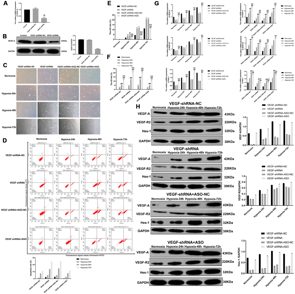 We analyzed the expression of VEGF-A, VEGFR2, and Hes-1 in cells transduced with VEGF-shRNA or the corresponding negative control and transfected also with ASO-NC or miR-203a-3p-ASO. As shown in Figure 8G, mRNA levels of VEGF-A and VEGFR2 increased gradually with hypoxia (24, 48 and 72 h) in the four groups (VEGF-shRNA-NC, VEGF-shRNA, VEGF-shRNA+ASO-NC and VEGF-shRNA+ASO) of PMVECs and mRNA levels of Hes-1 showed a decrease after 72 h. Meanwhile, VEGF-A, VEGFR2, Hes-1 mRNA expression in the VEGF-shRNA and VEGF-shRNA+ASO-NC groups was significantly lower than in the VEGF-shRNA-NC group. In contrast, VEGF-A, VEGFR2, Hes-1 mRNA expression in the VEGF-shRNA+ASO group was mostly increased compared with the VEGF-shRNA-NC, the VEGF-shRNA or the VEGF-shRNA+ASO-NC groups. Meanwhile, in line with western blotting results confirmed that VEGF-A and VEGF-R2 expression increased with hypoxia (24, 48 and 72 h) in the four cell groups, with a slight decrease in Hes-1 levels observed after 72 h (Figure 8H).