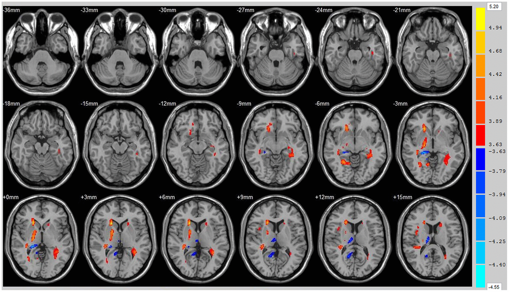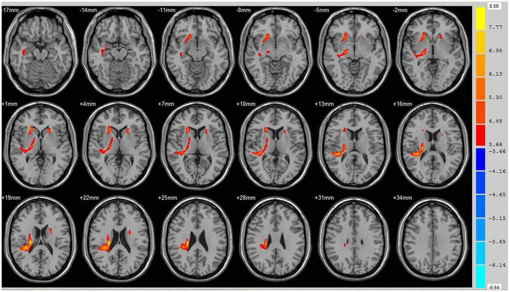 Using the whole brain analysis, we found that 1 week after ICH, patients displayed lower FA values in two brain clusters that included the ipsilateral temporal lobe, frontal lobe, insula, lenticular nucleus, putamen, caudate nucleus, hippocampus and thalamus than did the controls (Figure 1 and Supplementary Table 1). Two clusters with decreased FA values were also observed at week 12 (Figure 2 and Supplementary Table 2). Moreover, 12 weeks after ICH, six clusters (ipsilateral frontal lobe, lenticular nucleus, caudate nucleus, putamen, globus pallidus, and the contralateral parietal lobe, temporal lobe and hippocampus) exhibited higher FA (Figure 3, orange and Supplementary Table 3) while two clusters (ipsilateral limbic lobe, posterior cingulate gyrus and hippocampus) exhibited lower FA than at week 1 (Figure 3, blue and Supplementary Table 4).