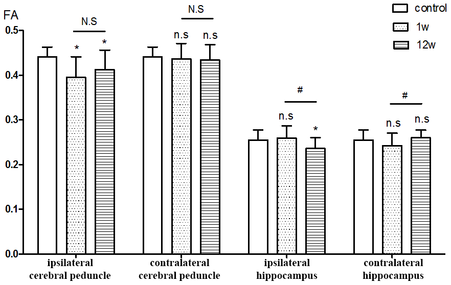 In addition to impaired motor function, a decline of cognition is a common and serious outcome after ICH. This cognitive dysfunction after ICH not only adversely affects patients’ life quality, it also hinders the recovery of neurological function [26]. Fortunately, one study found that vascular cognitive impairment is reversible when treated at an early stage [27]. In those cases, therefore, early detection and intervention are crucial to improving the prognosis. Although the hippocampus is the most critical region for cognition and memory [15], acute ischemic stroke elsewhere in the brain may also cause cognitive dysfunction [28]. For instance, Yakushiji et al revealed an association between microbleeds in the basal ganglia and cognitive impairment [29]. In addition, Kokubo et al found a decline in executive function in patients who hemorrhaged within the putamen [30]. Other studies [31, 32] confirmed that cortical infarction can lead to hippocampal atrophy, metabolic dysfunction, and memory decline. Recently, Shi et al detected significant cognitive impairment after basal ganglia hemorrhage, accompanied by reduced spine density on ipsilateral hippocampus neurons [33]. In the present study, we found that cognitive function is diminished as early as week 1 after ICH, and whole brain-based analysis of DTI data showed a decline in FA values in the ipsilateral hippocampus. By week 12 after ICH, cognitive function had deteriorated, and there was a further decline in the FA value in the ipsilateral hippocampus. The mechanism by which distant regions are injured after a local cerebral hemorrhage has not been fully elucidated, but it may be related to axonal degeneration, neurotransmitter dysregulation, inflammatory responses, neurotoxic factors and/or activated autophagy. Notably, the FA value for the contralateral hippocampus was significantly higher at week 12 than week 1, suggesting the contralateral hippocampus may play a compensatory role after the secondary injury to the ipsilateral hippocampus. In addition, we found that the ipsilateral hippocampus FA values during weeks 1 and 12 after ICH correlated with the MMSE and MoCA, suggesting this FA value may be predictive of cognitive function after ICH.