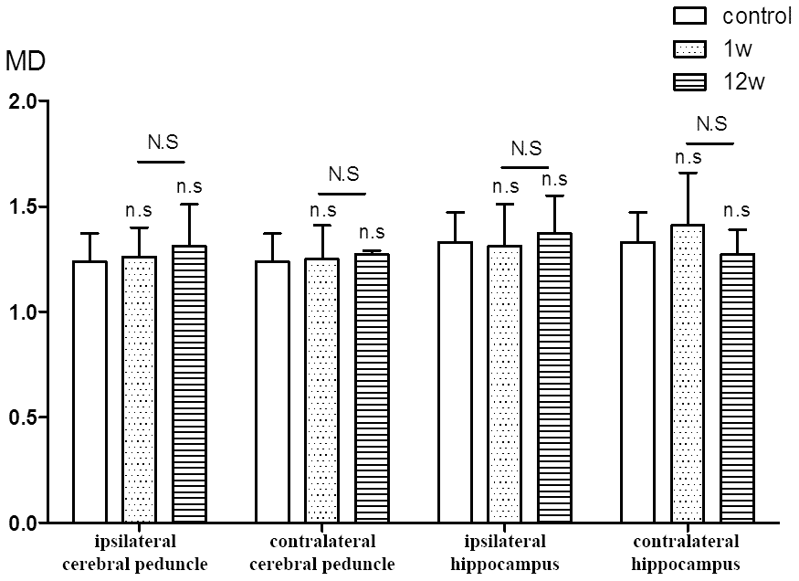No significant differences for MD values were found between the ICH and control groups, nor was there a within-group difference between ICH group at week 1 and at week 12. The MD values reflect the overall diffusion ability and do not depend on the direction of diffusion. Although the dissolution of the myelin sheath and axon can lead to increases in water molecule motion and MD values, the proliferation of glial cells during WD restricts the movement of water molecules, which we assume is the reason for the lack of obvious changes in MD in our study.