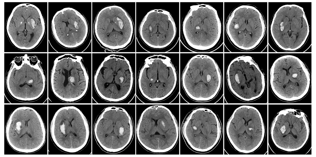 The Ethics Committee of the Clinical Medical College of Yangzhou University approved this study, and written informed consent was obtained from each subject. ICH patients hospitalized in the Department of Neurology and undergoing medical therapy were consecutively enrolled between June 2016 and December 2016. Inclusion and exclusion criteria are listed in Table 3. Single deep supratentorial intracerebral hemorrhage, including in the basal ganglia and thalamus, was diagnosed by CT (Figure 7). A total of 21 ICH patients were included (among which 16 were male); the mean age was 59.29 ± 9.89 years (range from 45-75). Ten healthy volunteers matched in age, sex and education level were recruited as a control group.