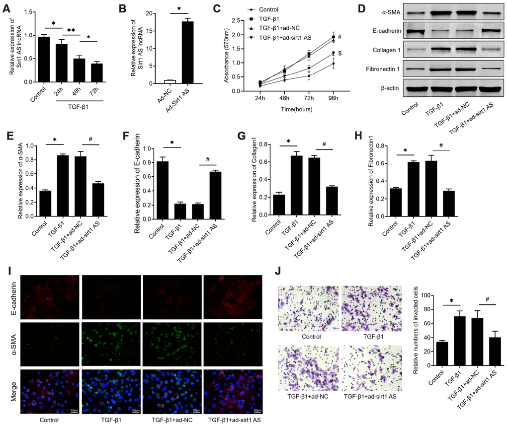 Firstly, we examined the expression levels of sirt1 AS in TGF-β1 treated RLE-6TN cells, with the finding that 10 ng/ml TGF-β1 treatment down-regulated sirt1 AS expression in a time-dependent manner (Figure 1A). We therefore overexpression of sirt1 AS to explore its role in TGF-β1-mediated fibrinogenesis (Figure 1B). As depicted in Figure 1C, 10 ng/ml TGF-β1 treatment resulted in significantly increase in cell viability (Figure 1C). whereas, overexpression of sirt1 AS notably suppressed TGF-β1-induced cell viability (Figure 1D). In addition, the results of western blot in Figure 1E–1H revealed that TGF-β1 treatment induced increase in the protein expression of α-SMA, collagen1 and fibronectin1, and decrease in E-cadherin. However, overexpression of sirt1 AS in TGF-β1-treated RLE-6TN cells could reverse the change of above-mentioned EMT markers. Using immunofluorescence analysis, we confirmed that overexpression of sirt1 AS could reverse TGF-β1-induced EMT, as evidenced by increased E-cadherin and decreased α-SMA expression (Figure 1I). Furthermore, the results of Transwell assay showed that overexpression of sirt1 AS significantly abolished TGF-β1-induced cell migration (Figure 1J). Collectively, these results suggested that overexpression of sirt1 AS suppressed TGF-β1-mediated fibrinogenesis in pulmonary alveolar cell.